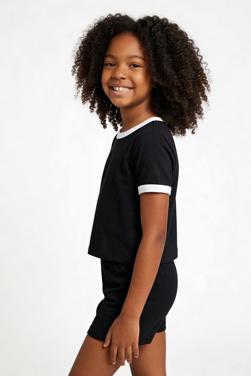 A Blusa Cropped Infantil Ringer da Caedu é a escolha perfeita para um visual moderno e confortável. Feita em algodão macio, oferece liberdade de movimento e um toque suave. Seu design preto e branco com detalhes ringer adiciona um charme único, ideal para a moda infantil.