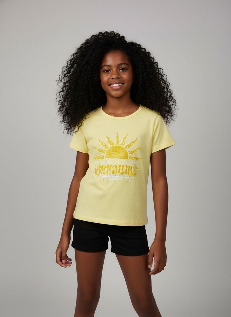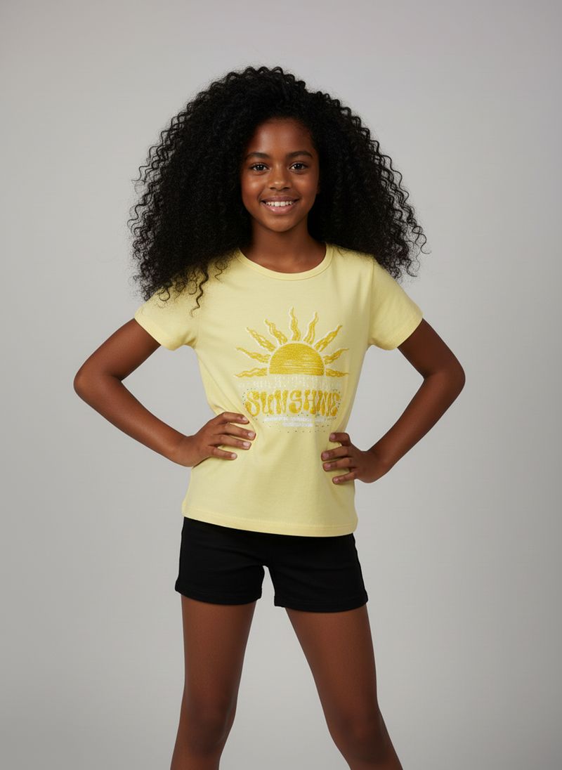 A Blusa Infantil Amarela da Marca Infantil é puro conforto e alegria para sua pequena! Feita em COTTON macio, esta roupa infantil apresenta uma estampa vibrante de sol com a frase "SUNSHINE", perfeita para iluminar qualquer look. Essencial na moda infantil, garante diversão com estilo.