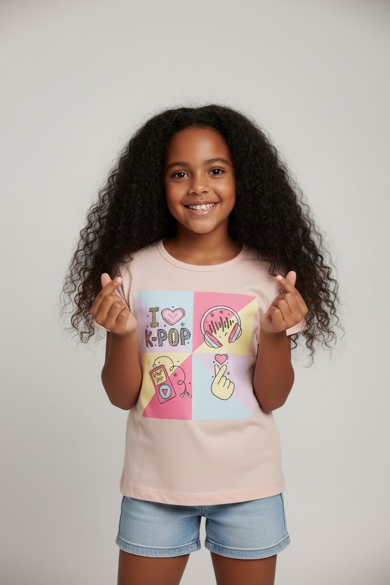 Mostre seu amor por K-POP com a Blusa Juvenil K-POP Mania Rosa Claro Algodão Seda Caedu. Em algodão, oferece conforto e leveza. Sua estampa 'I LOVE K-POP' e design exclusivo trazem moda e personalidade ao seu dia a dia. Uma roupa vibrante para fãs!