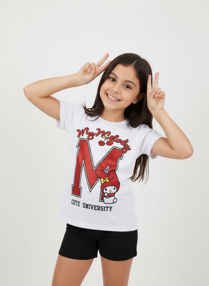 A Blusa Infantil My Melody Cute University Branca Caedu oferece conforto e estilo. Em meia malha, é leve e perfeita para o dia a dia. Sua estampa vibrante My Melody e "Cute University" adiciona um charme único, ideal para a moda infantil.