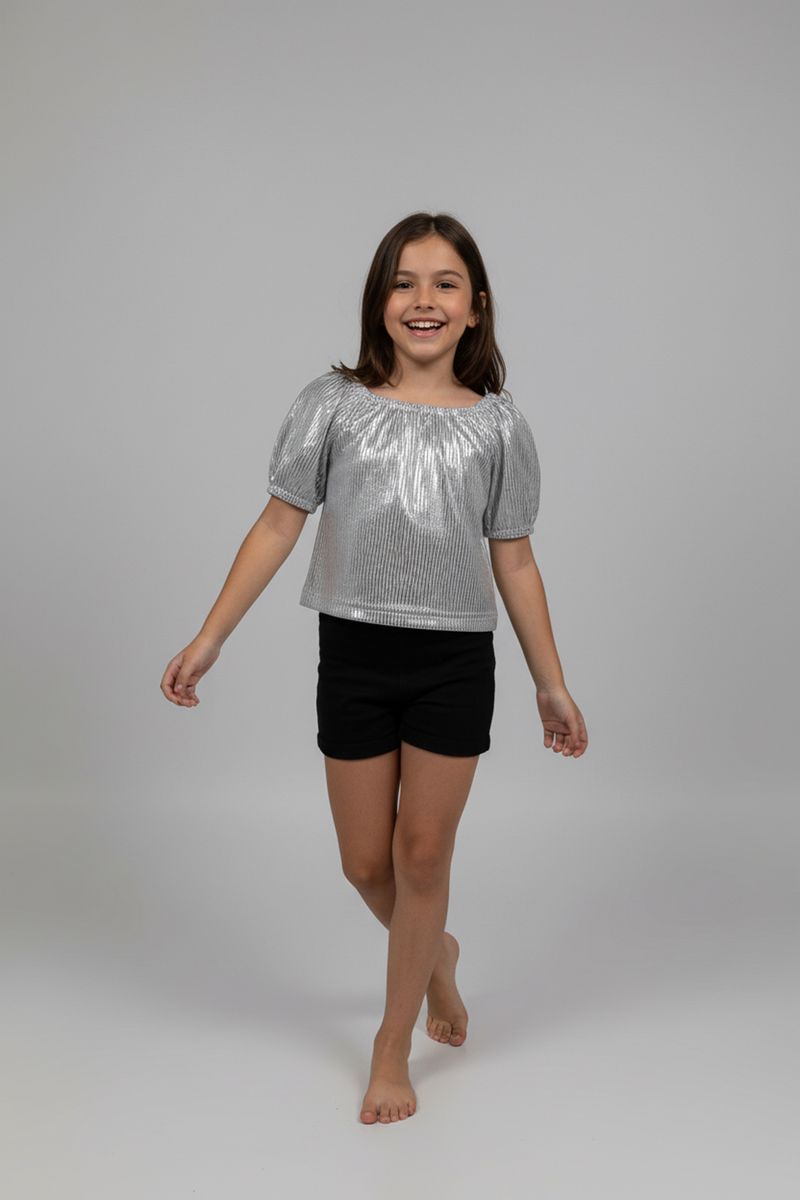A Blusa Infantil Prata Metalizada Brilhante Caedu é a escolha perfeita para um visual cheio de estilo. Com mangas bufantes, decote franzido e um brilho único, esta roupa infantil oferece conforto e um toque de modernidade para as pequenas fashionistas. Ideal para criar looks que se destacam na moda infantil.