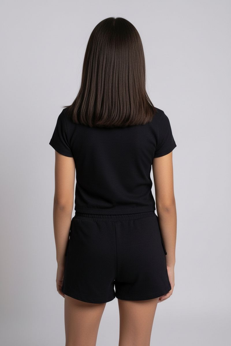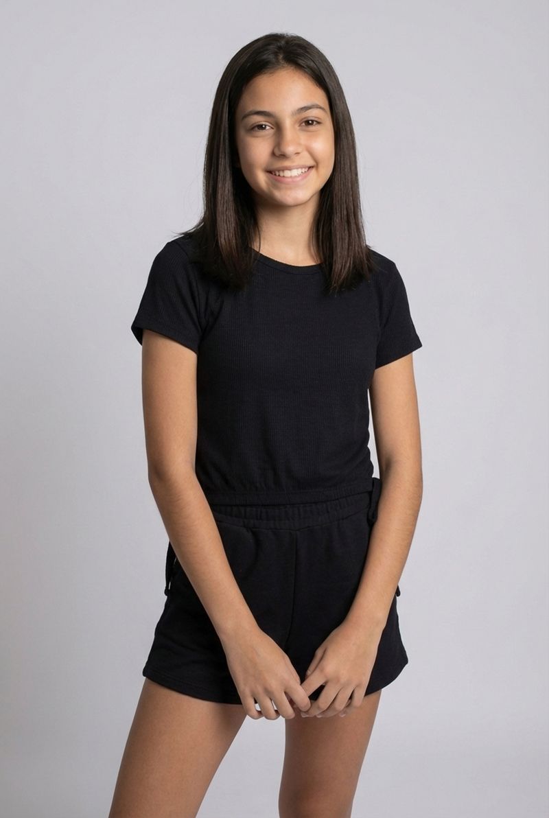 Combine a Blusa Juvenil Canelada Preta com Colisse com shorts jeans para um visual despojado, ou com uma saia estampada para um toque mais divertido. Complete o look com tênis casuais ou sandálias, e adicione acessórios como colares delicados ou pulseiras para um estilo único e cheio de personalidade.