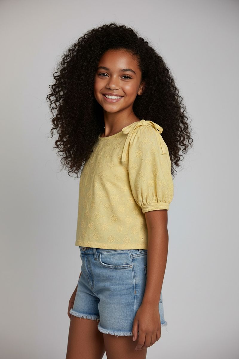 A Blusa Ciganinha Cropped Amarela Caedu é perfeita para um look infantil cheio de estilo e conforto. Com decote ombro a ombro, efeito laise delicado e amarração nos ombros, esta roupa em meia malha oferece leveza e um toque de moda para as meninas.