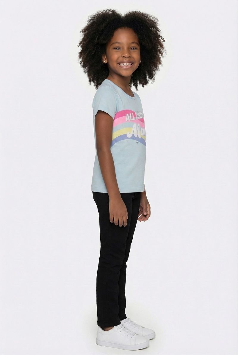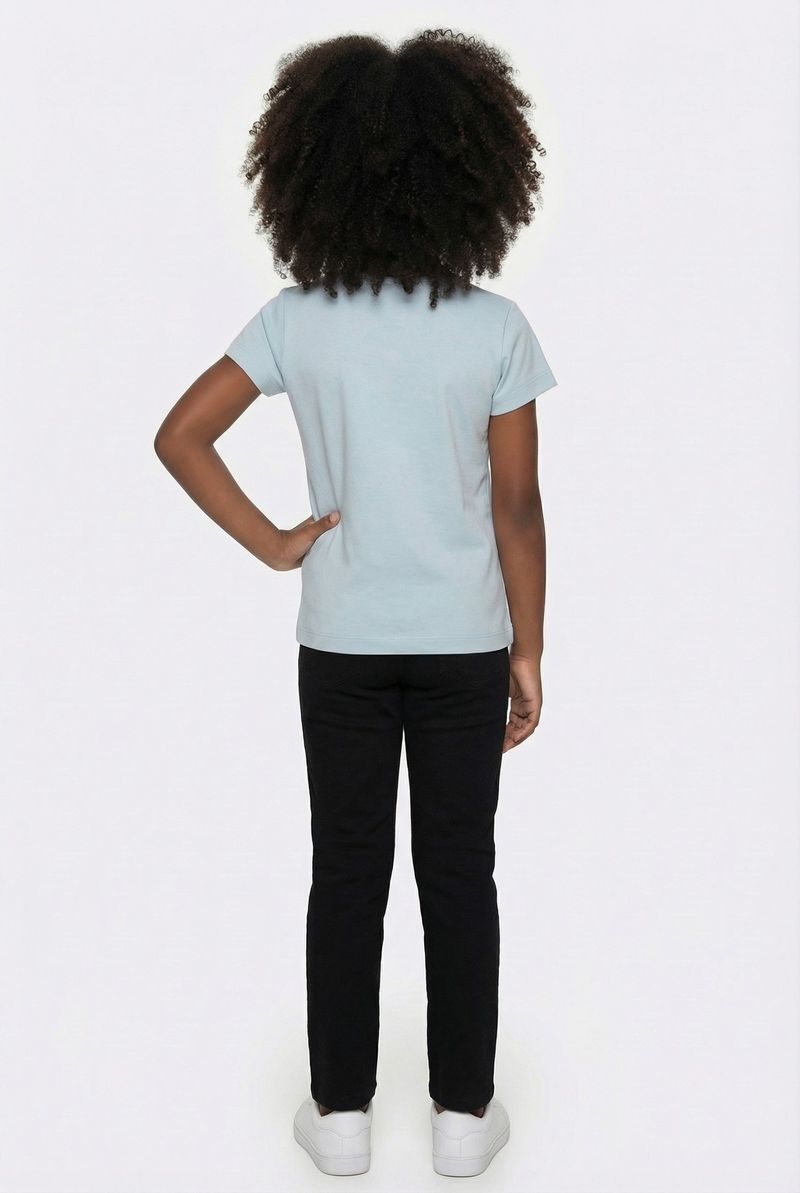 Combine esta blusa azul claro com um shorts jeans e tênis para um look casual e divertido, perfeito para o dia a dia. Para um toque mais despojado, aposte em uma saia de tule colorida e sapatilhas. Em dias mais amenos, uma calça legging e jaqueta completam o visual, garantindo conforto e estilo em todas as aventuras da sua pequena. Adicione acessórios como tiaras e pulseiras para um look ainda mais charmoso.