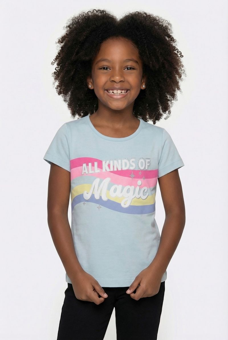 Deixe a magia acontecer com a Blusa Infantil 'All Kinds of Magic' da Caedu. Em um suave azul claro, esta peça de roupa infantil é feita em cotton macio e respirável, garantindo conforto e liberdade de movimento para as pequenas. Com estampa vibrante de arco-íris e estrelas com glitter, ela inspira sonhos e aventuras, perfeita para o dia a dia e ocasiões especiais. Possui mangas longas e gola redonda, ideal para todas as estações.