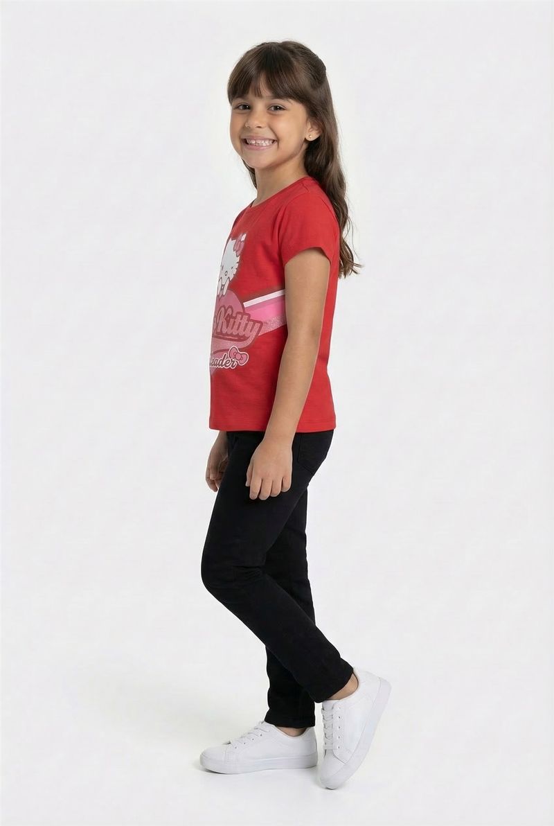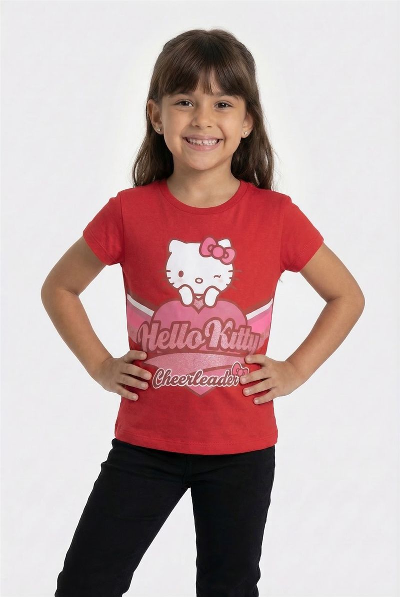 A Blusa Infantil Hello Kitty Cheerleader Vermelha Caedu é a roupa perfeita para as pequenas. Em meia malha, destaca a icônica Hello Kitty em um design divertido de cheerleader, com um coração rosa. Conforto e moda infantil vibrante para o dia a dia.
