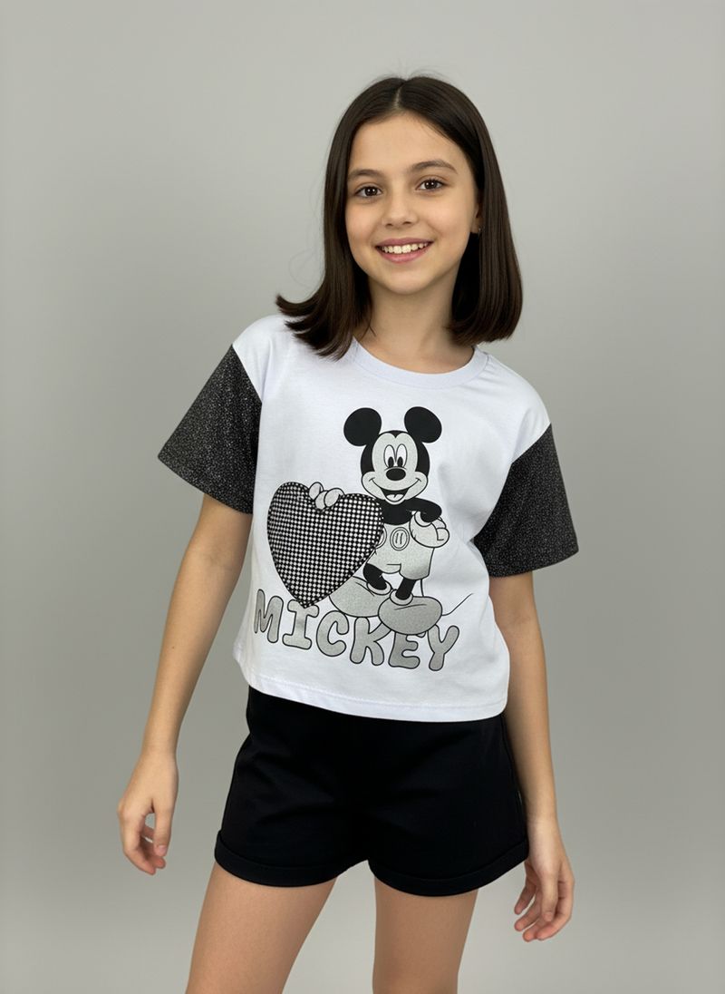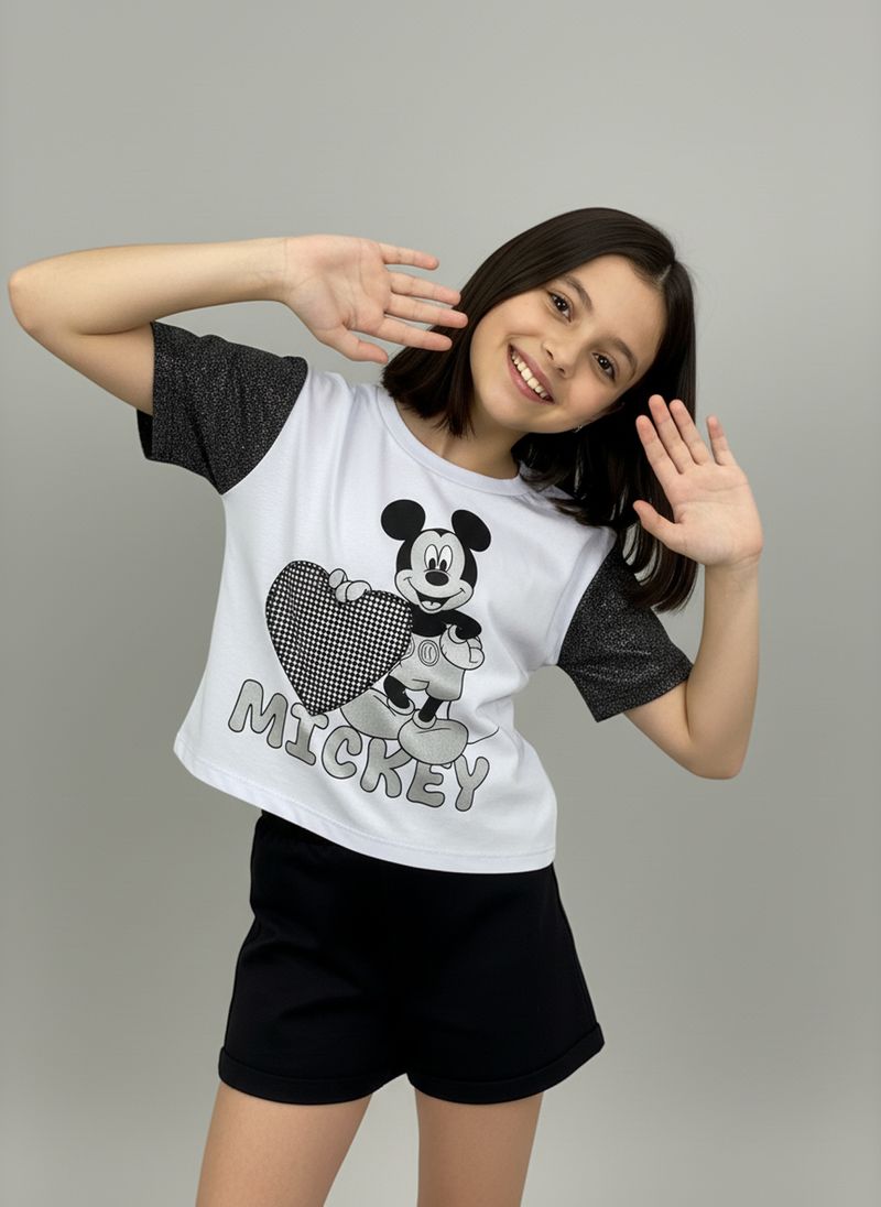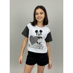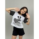 Detalhes: Estampa Mickey Mouse, coração xadrez, mangas texturizadas