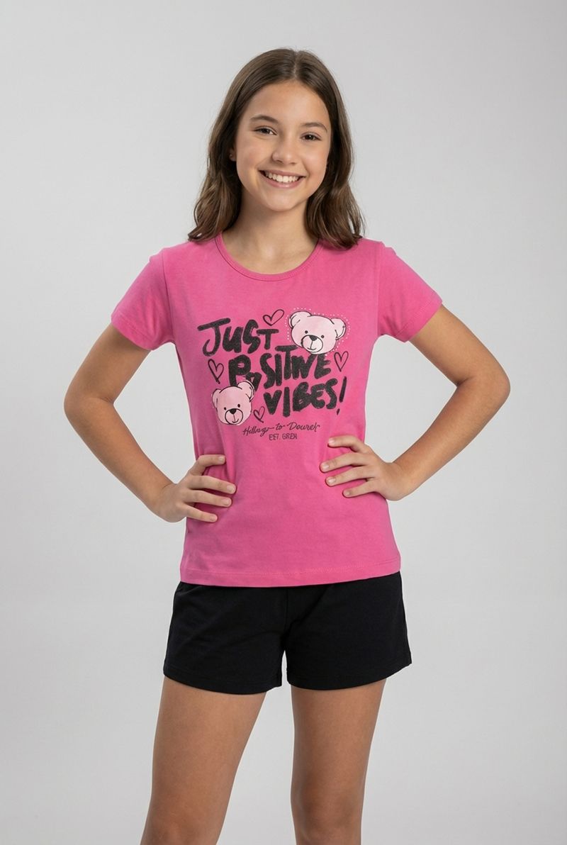 A Blusa Juvenil Pink 'Positive Vibes' Caedu é a escolha perfeita para meninas que amam moda e conforto. Com sua cor vibrante e estampa inspiradora de ursos e corações, ela transmite alegria e positividade. Ideal para o dia a dia, esta roupa da Caedu garante um visual cheio de estilo.
