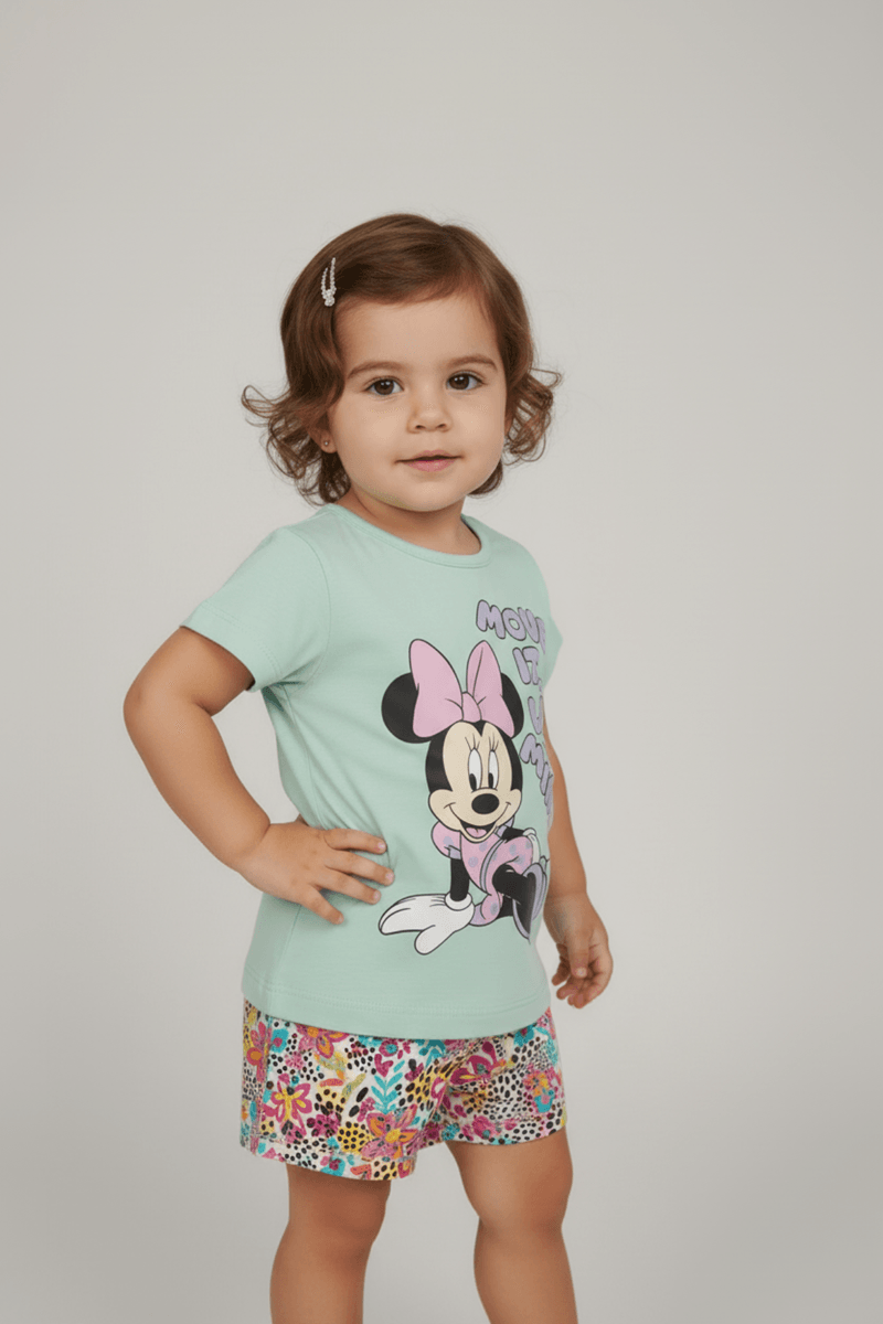A Blusa Infantil Minnie Caedu em verde aqua é perfeita para as pequenas que amam a personagem! Feita em meia malha 100% algodão, oferece máximo conforto e toque suave. Com estampa divertida da Minnie e a frase "MOVE IT. LIKE MINNIE", é ideal para um visual alegre e cheio de moda infantil.