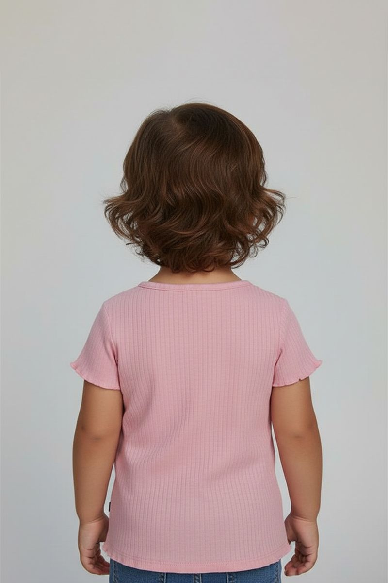 Combine a blusa rosa claro com uma calça jeans azul para um visual casual e moderno, ou com um shorts estampado para um look divertido. Para um toque mais arrumado, use com uma saia e uma sandália delicada. Complete com tênis para brincadeiras ou sapatilhas para ocasiões especiais.