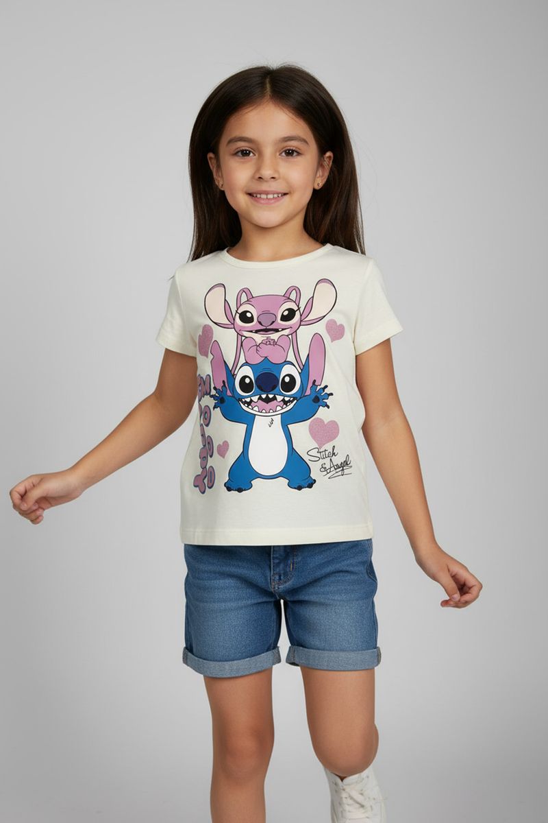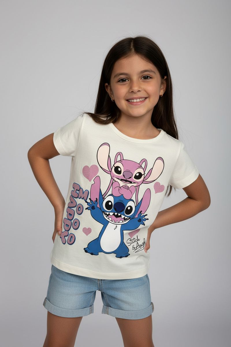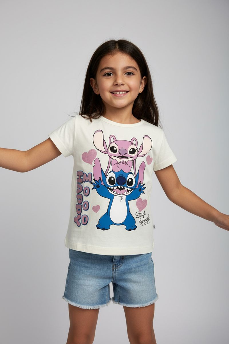 A blusa infantil Caedu, em meia malha off white, celebra a alegria com Stitch e Angel. Perfeita para meninas, esta roupa infantil oferece conforto e estilo, ideal para brincar e expressar felicidade. Encontre moda infantil de qualidade e preço bom.