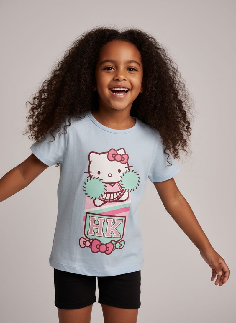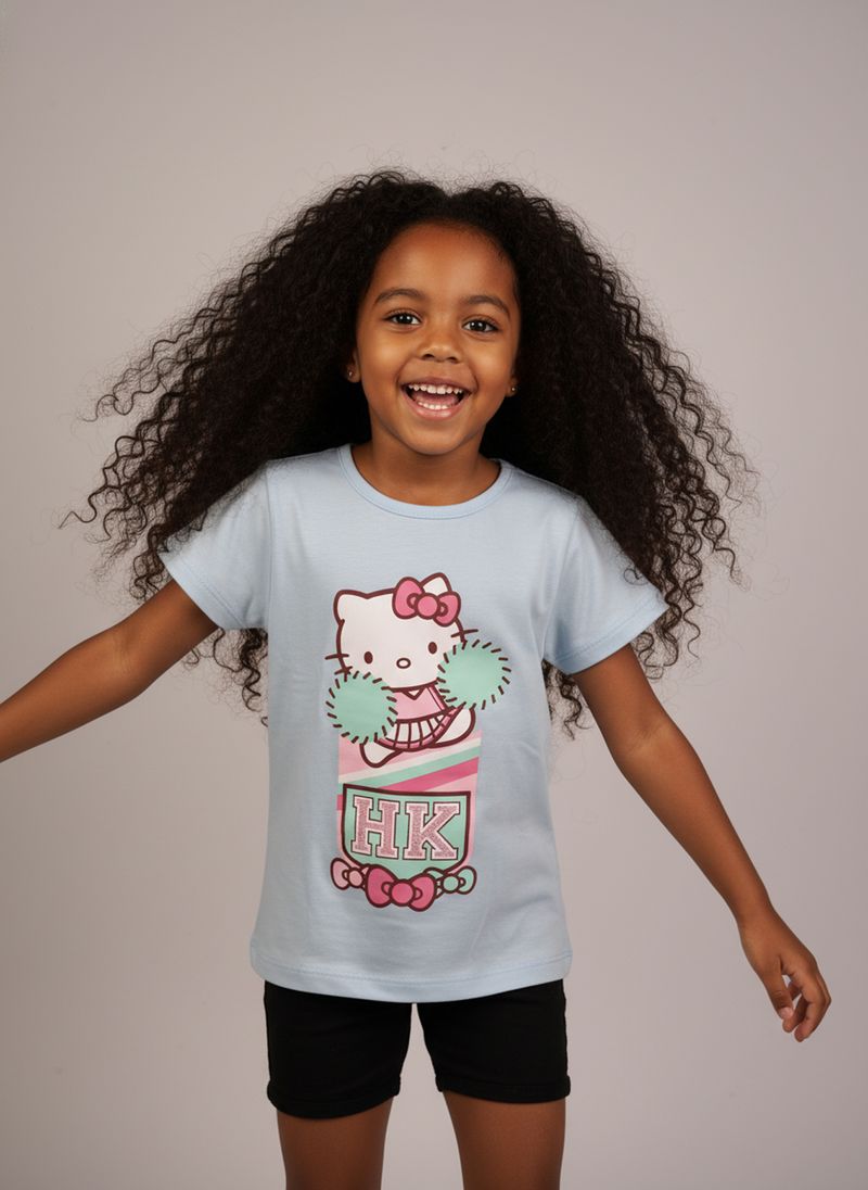 A Blusa Infantil Hello Kitty Líder de Torcida Caedu é a escolha perfeita para um look divertido e confortável. Confeccionada em meia malha, esta roupa infantil azul claro apresenta uma vibrante estampa da Hello Kitty como líder de torcida, ideal para as pequenas que amam estilo e diversão.