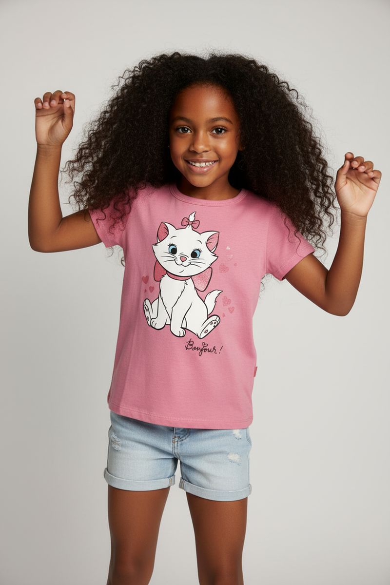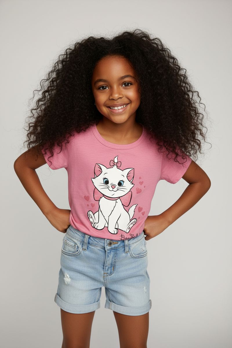 A Blusa Infantil Gatinha Marie Rosa da Caedu oferece conforto e estilo para as pequenas. Feita em meia malha, possui estampa da Gatinha Marie com laço glitter e corações, garantindo um visual encantador e cheio de brilho. Perfeita para o dia a dia, é a roupa infantil ideal.