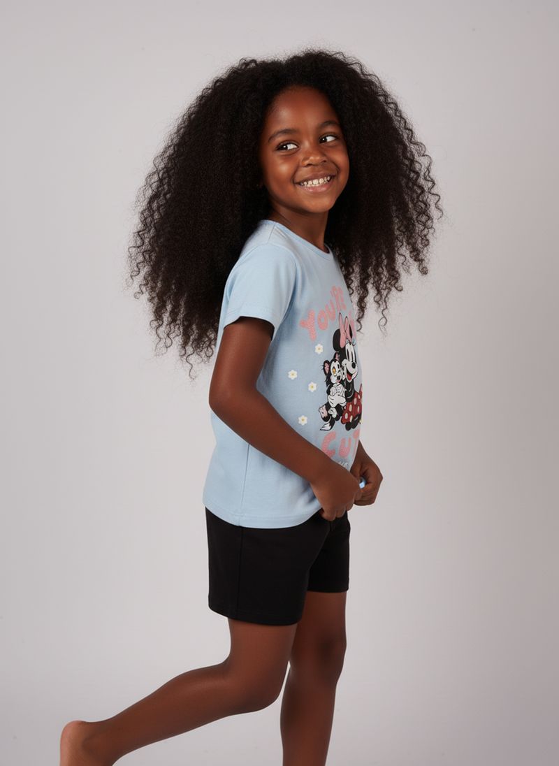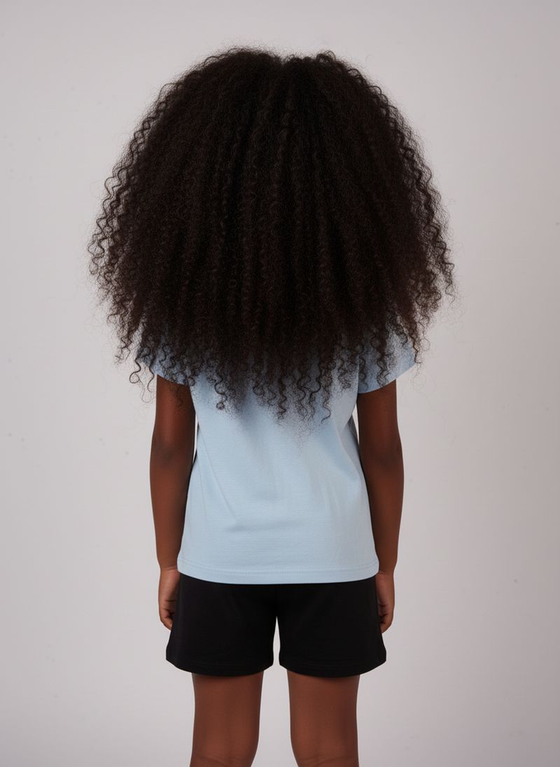 Combine esta blusa azul claro com shorts pretos ou jeans para um visual casual e despojado. Para um toque ainda mais charmoso, adicione uma saia colorida e complete o look com tênis confortáveis ou sapatilhas delicadas. Uma peça versátil para criar diversos looks infantis cheios de personalidade.