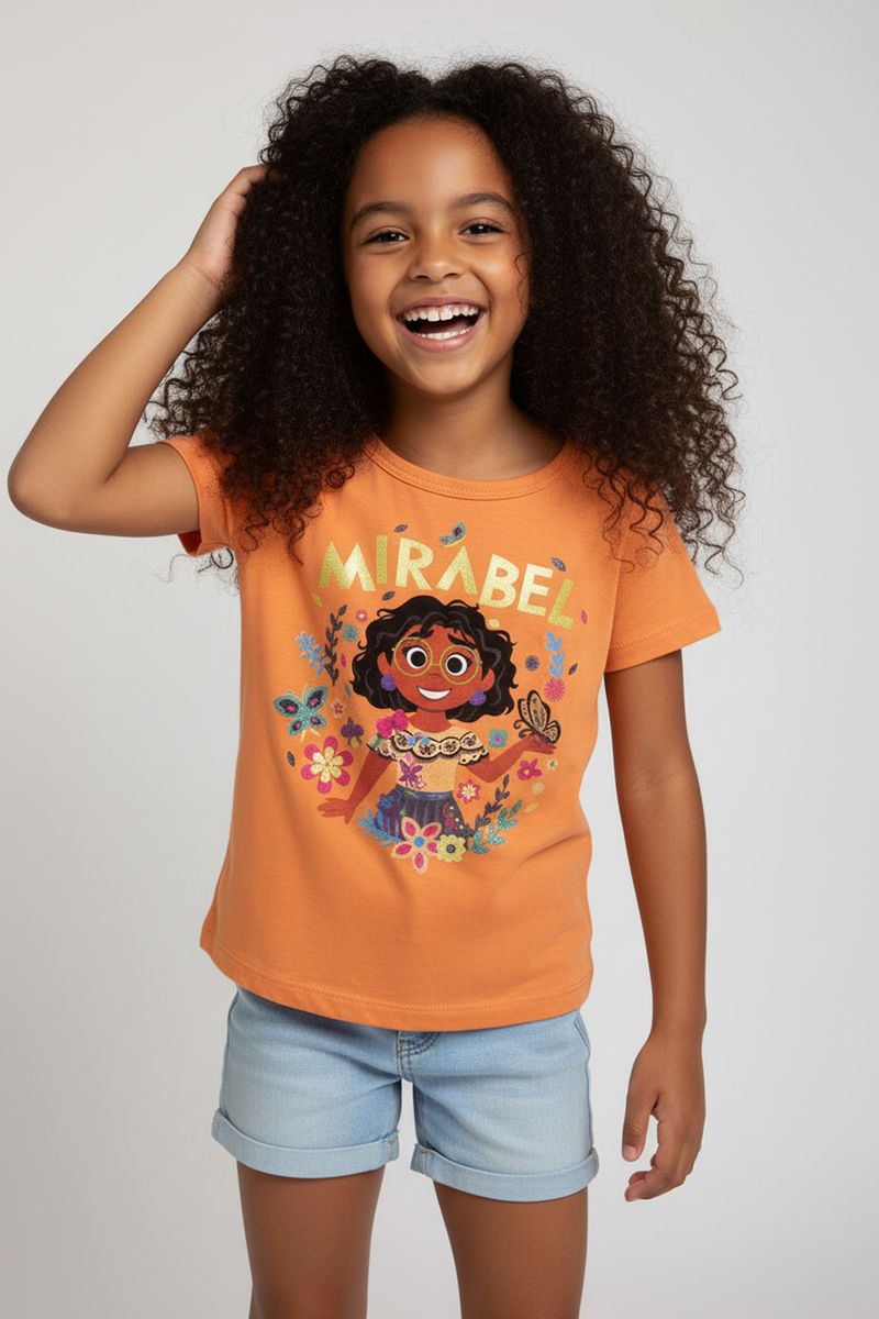 Detalhes: Estampa gráfica detalhada e colorida da personagem Mirabel, com flores e borboletas