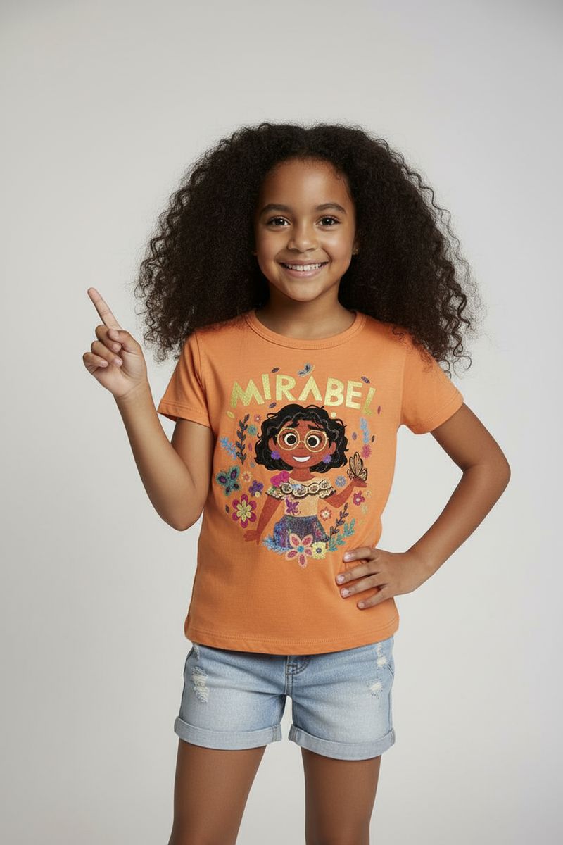 Vista sua pequena com a alegria da Blusa Infantil Mirabel Encanto Coral Estampada Caedu. Confeccionada em meia malha, esta blusa vibrante oferece conforto e estilo para o dia a dia. Com uma estampa colorida da Mirabel e flores, é a escolha perfeita para um visual encantador e cheio de vida, ideal para as roupas da sua menina.