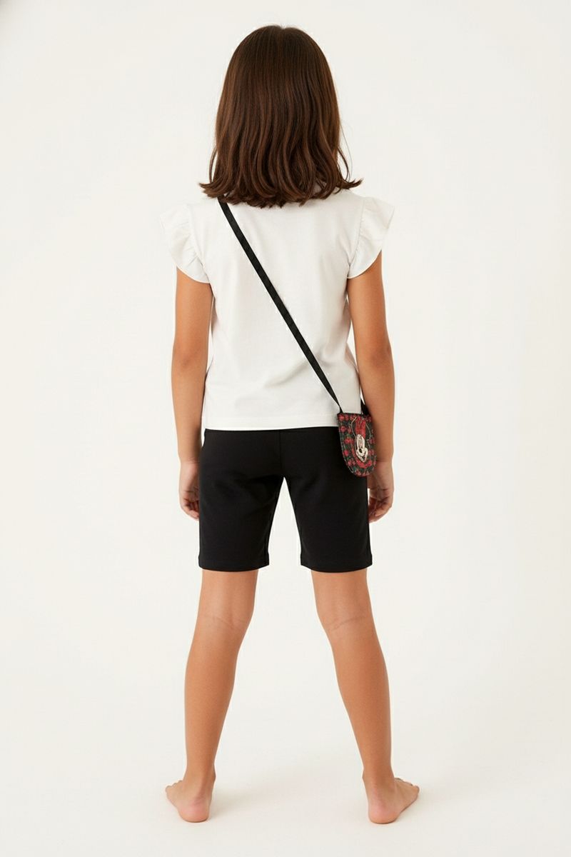 Combine a Blusa Minnie Cherrific com shorts pretos para um visual despojado e divertido, como visto na imagem. Para um toque mais casual, aposte em saias jeans ou leggings coloridas. Complete o look com tênis confortáveis e acessórios lúdicos, garantindo que sua menina esteja sempre na moda com as roupas Caedu.