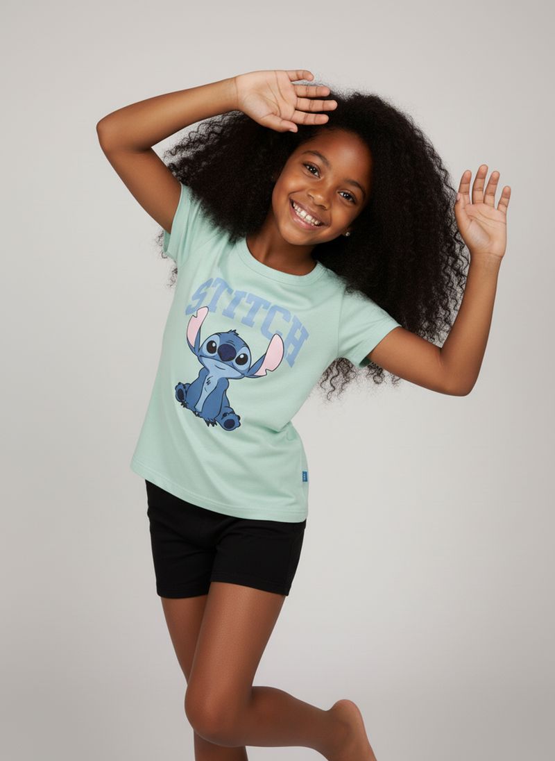 A Blusa Infantil Stitch Verde Água Caedu é a escolha perfeita para o dia a dia da sua filha, unindo conforto e muita diversão. Confeccionada em meia malha macia e respirável, esta blusa em um tom refrescante de verde menta clara apresenta uma estampa super fofa do adorável Stitch, garantindo looks cheios de alegria e personalidade. Ideal para as pequenas fashionistas que amam se sentir confortáveis e estilosas!