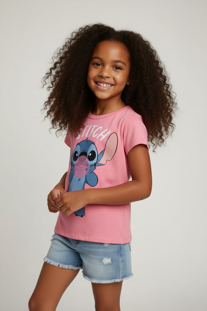 Blusa Infantil Caedu Stitch Rosa Claro é perfeita para as pequenas que amam estilo e diversão. Confeccionada em