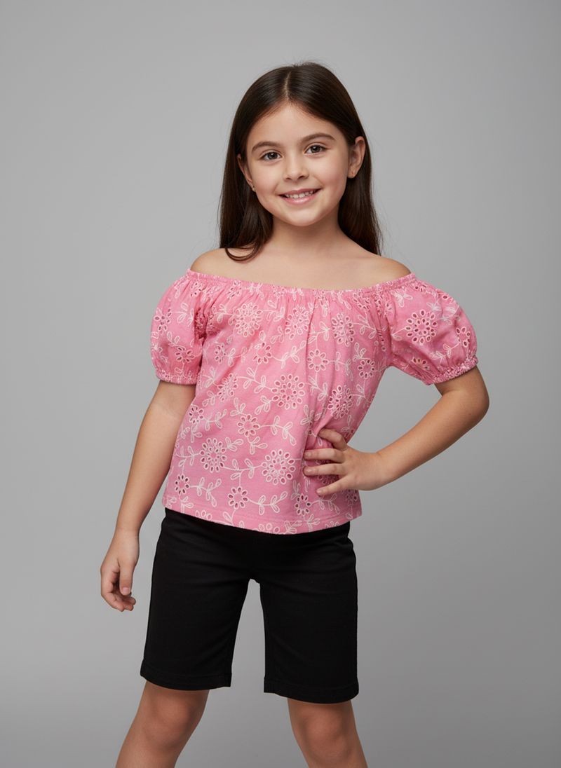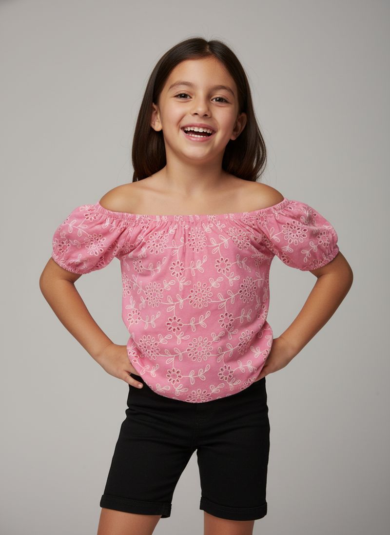 A Blusa Ciganinha Infantil Rosa da Caedu é perfeita para sua menina. Com delicado bordado laise floral e design ombro a ombro, oferece um visual charmoso e confortável. Ideal para criar looks cheios de estilo, esta roupa é um toque de moda e elegância para o guarda-roupa infantil.