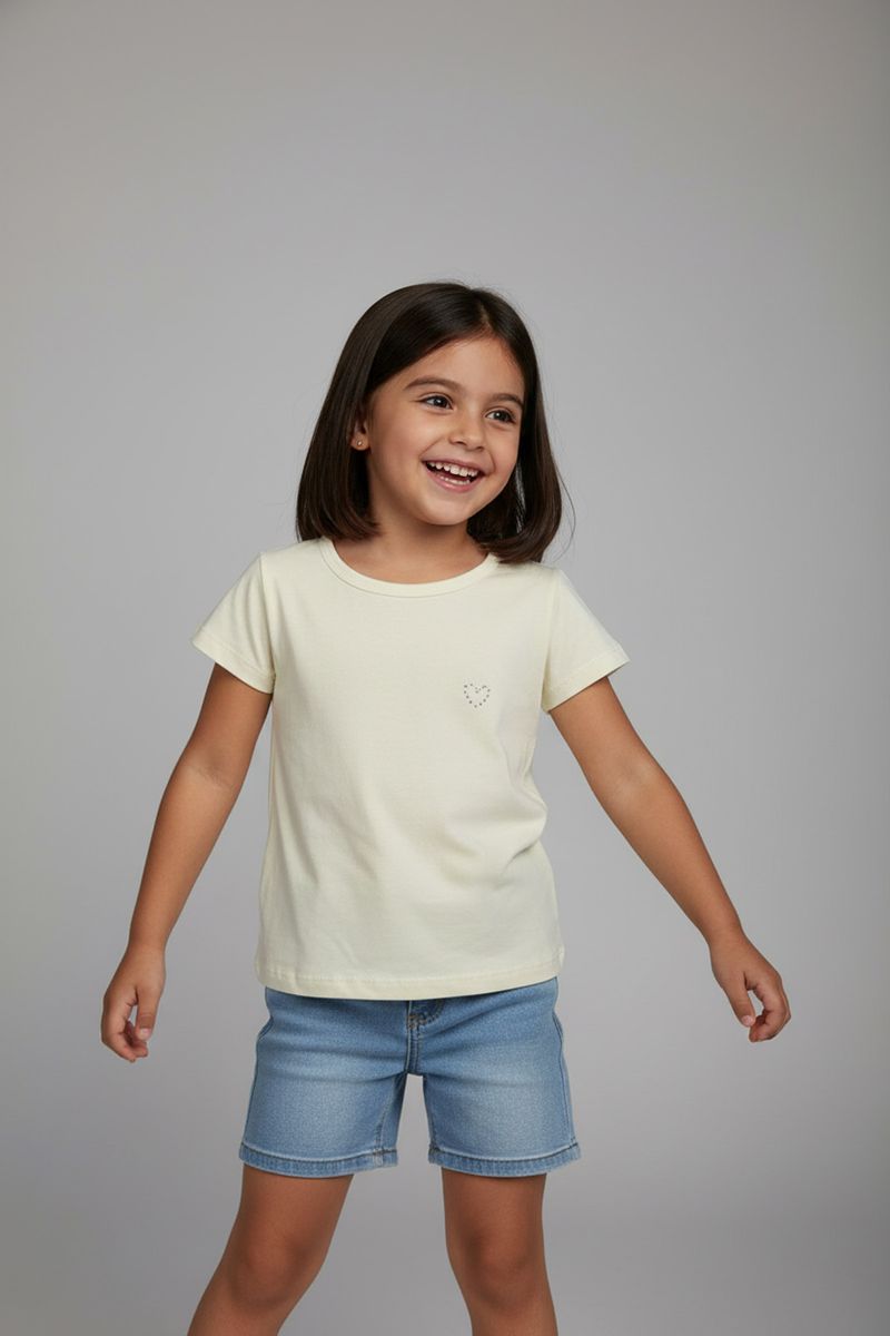 Combine a blusa com shorts jeans azul claro para um visual descontraído e moderno, como visto nas imagens. Para um toque mais arrumado, experimente com saias coloridas ou calças de sarja. Complete o look com tênis para brincar ou sapatilhas e sandálias para um passeio, criando um estilo único e cheio de personalidade.