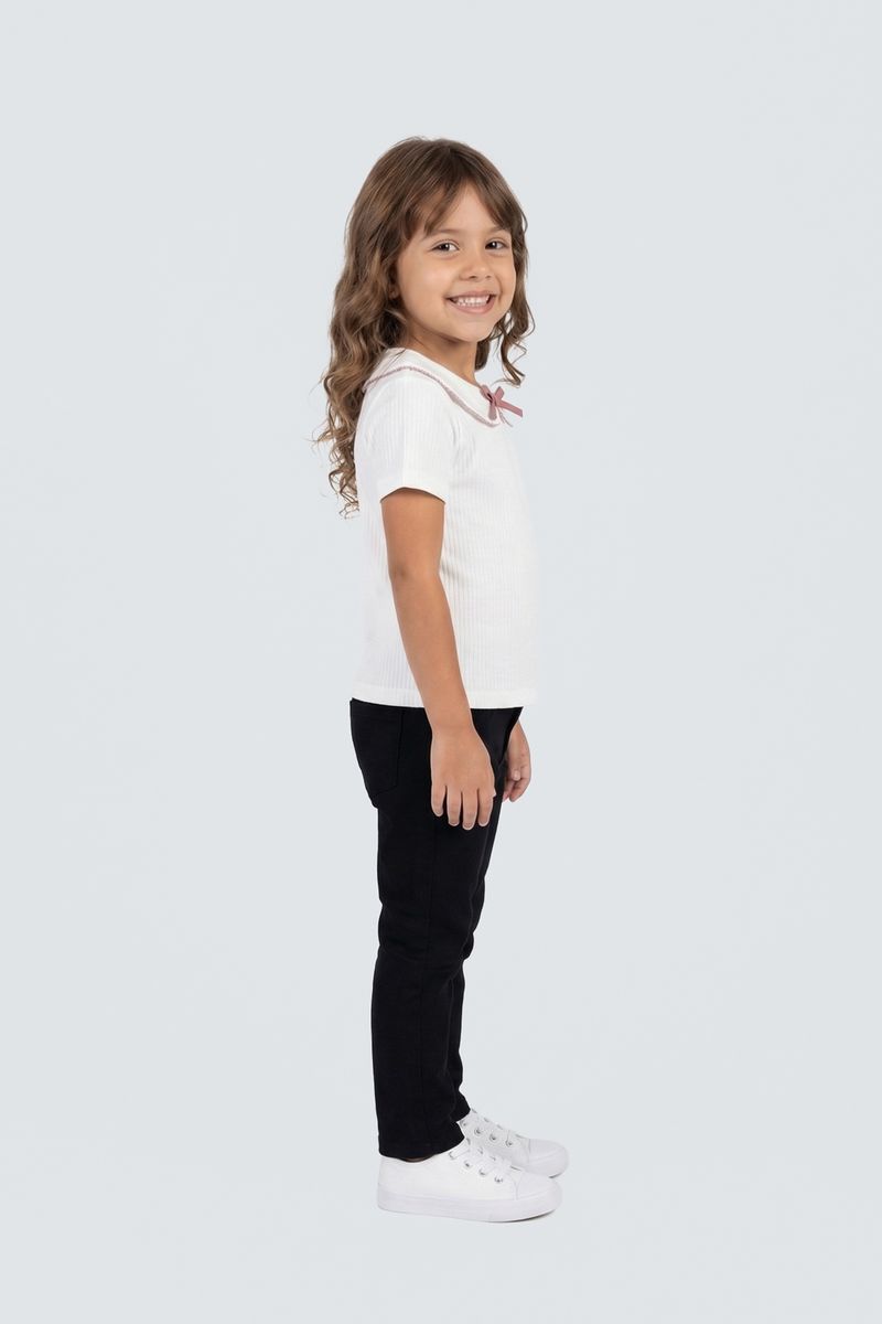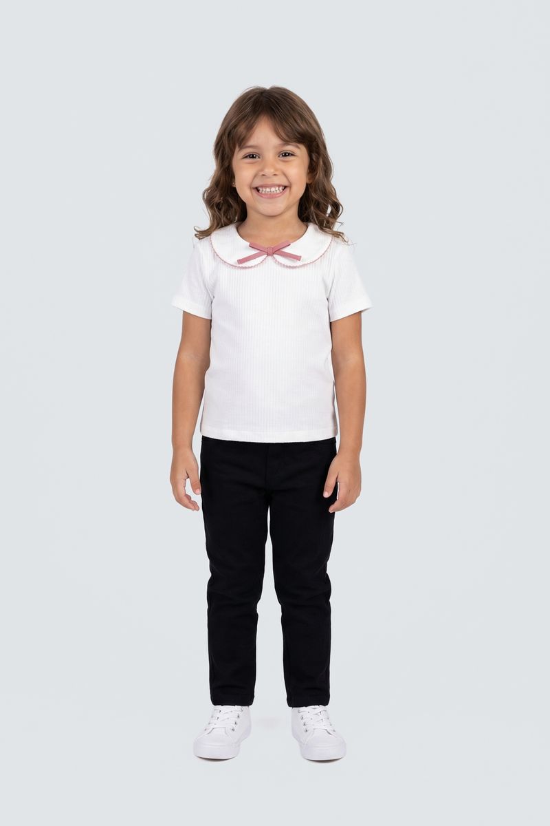 Descubra a Blusa Infantil Canelada Off White Caedu, perfeita para o dia a dia das pequenas. Com tecido ribana macio, charmosa gola Peter Pan com babado e um delicado laço rosa, oferece conforto e estilo. Ideal para looks adoráveis e cheios de personalidade, garantindo que sua filha esteja sempre na moda.