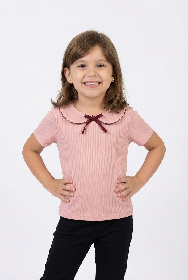 A Blusa Infantil Rosa Rosê Canelada Gola Peter Pan com Laço Bordô Caedu oferece conforto e estilo para sua pequena. Confeccionada em ribana, possui um design delicado com gola Peter Pan e laço bordô, ideal para a moda infantil.