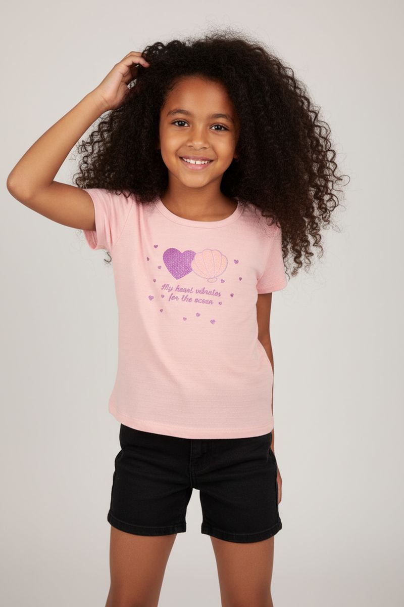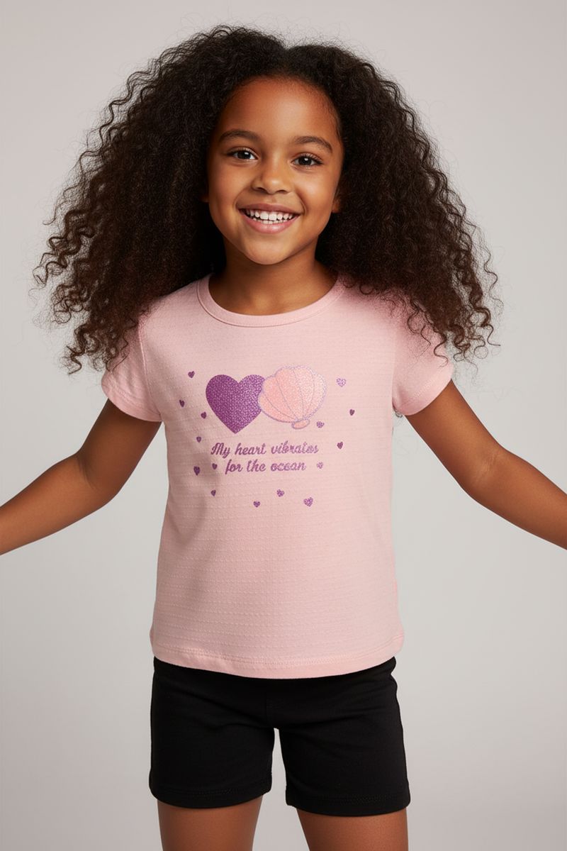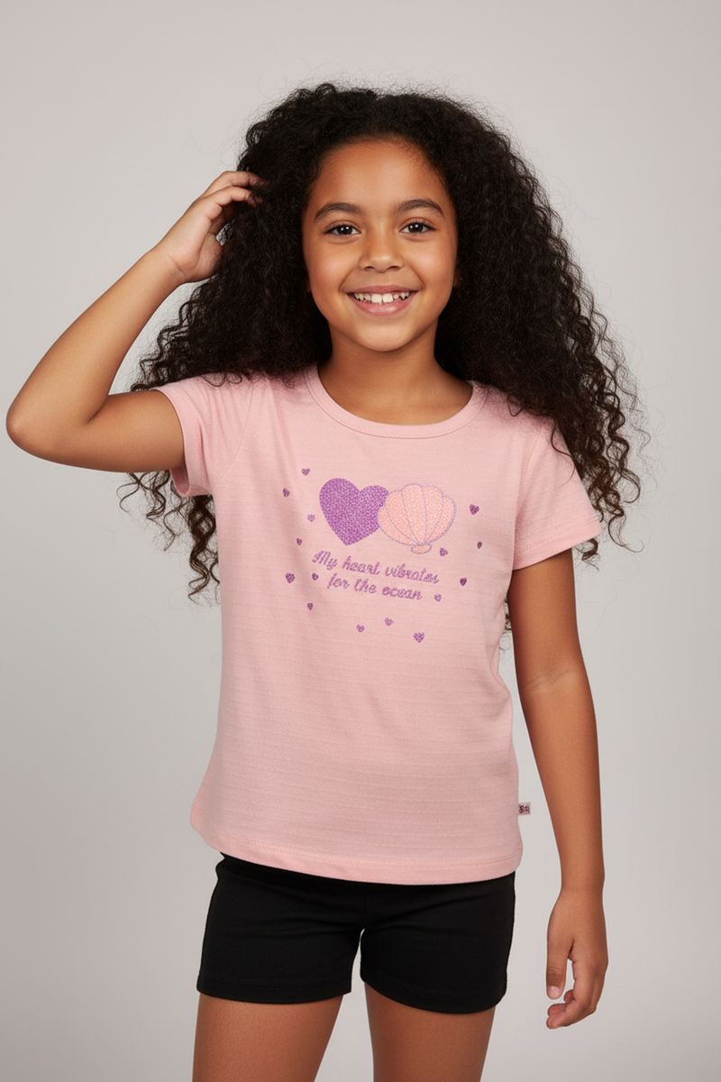 A Blusa Infantil Caedu em rosa claro é perfeita para as pequenas sonhadoras. Confeccionada em malha BUBBLE, oferece conforto e leveza. Com estampa 'Corações do Oceano' e aplique glitter, inspira alegria e estilo para o dia a dia. Uma roupa infantil cheia de charme!