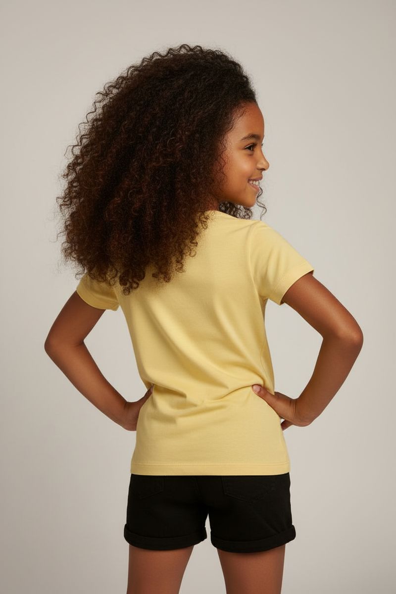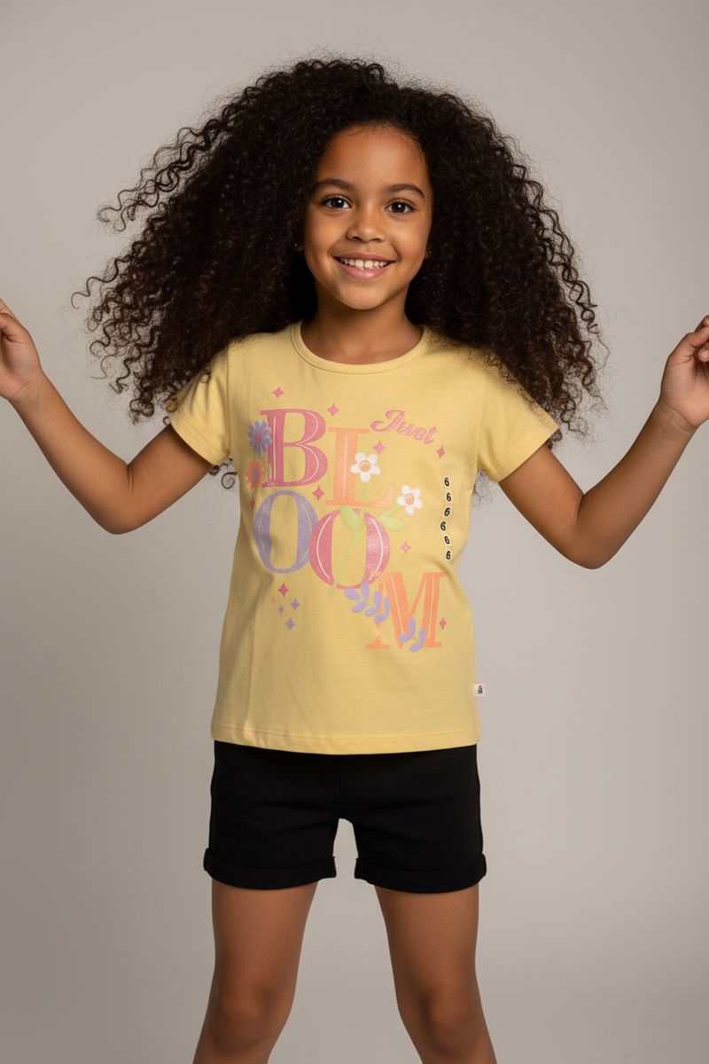 Combine a blusa amarela com um short preto para um look despojado e moderno, como visto na imagem. Para um visual mais delicado, aposte em saias jeans ou coloridas. Complete com tênis casuais para brincar ou sandálias para um toque mais arrumado, criando looks cheios de personalidade.