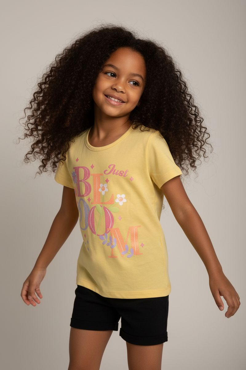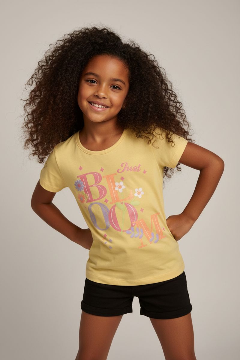 Inspire sua pequena com a Blusa Infantil Amarela 'Just Be Bloom' da Caedu. Confeccionada em ribana, oferece conforto e leveza. Sua estampa floral vibrante com brilho e a mensagem 'Just Be Bloom' trazem um toque de alegria e estilo para o dia a dia, tornando-a uma peça essencial na moda infantil.