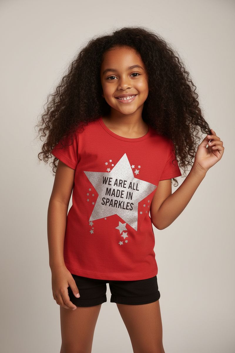 A Blusa Infantil Caedu Vermelha Estrela Glitter é ideal. Em ribana, oferece conforto e estilo. A estampa vibrante com estrelas prateadas e a mensagem 'Made in Sparkles' inspira alegria e confiança. Uma roupa infantil para o dia a dia.