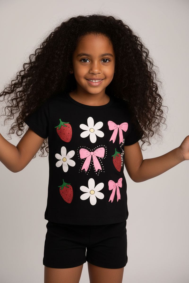 A Blusa Infantil Caedu preta, em meia malha, é perfeita para um visual alegre e confortável. Sua estampa vibrante de morangos, flores e laços rosas traz um toque divertido e muito estilo. Uma roupa infantil que as pequenas vão amar!