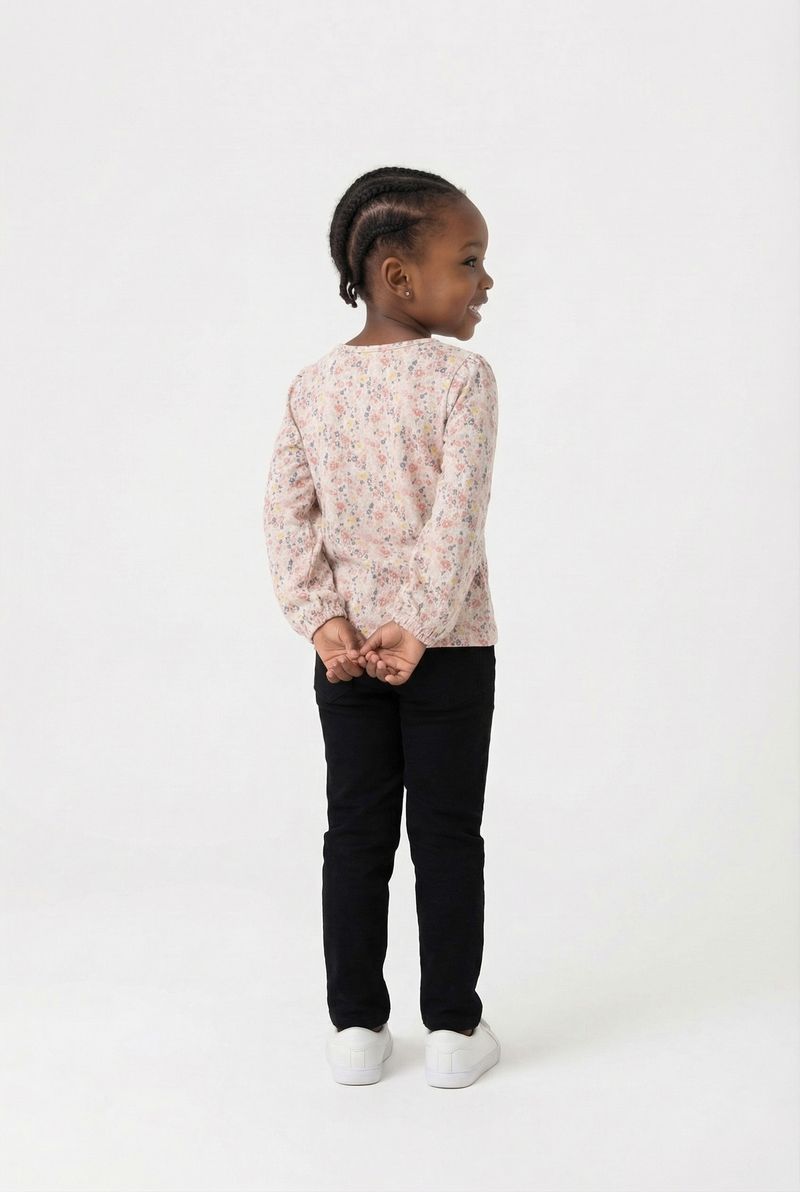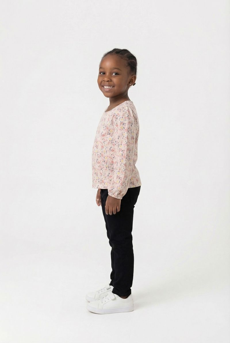 Combine esta blusa floral com uma calça jeans para um visual casual e moderno, ou com uma saia rodada para um toque mais delicado. Para os pés, tênis brancos ou sapatilhas coloridas complementam o look. Adicione acessórios como tiaras ou laços para um charme extra, criando produções versáteis e cheias de vida.