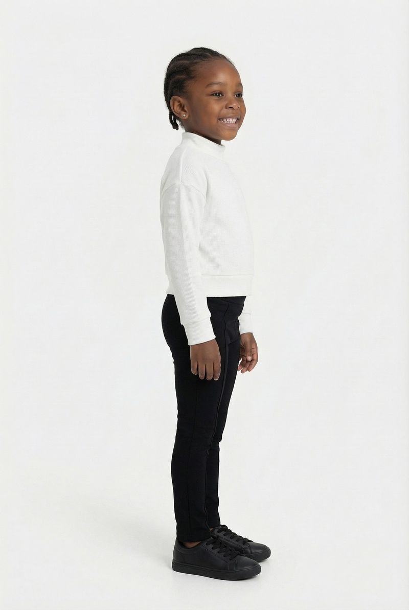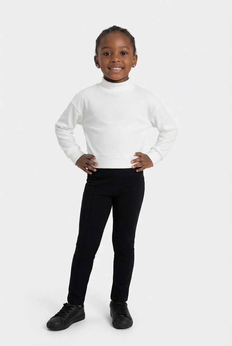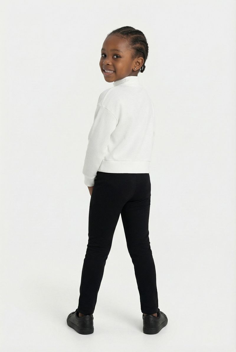 Combine a blusa com calças pretas justas para um visual moderno, como visto nas imagens. Para um estilo mais casual, use com jeans e tênis coloridos. Adicione um colete ou jaqueta para dias mais frios, criando camadas estilosas e versáteis para qualquer ocasião. Uma peça chave para a moda infantil.