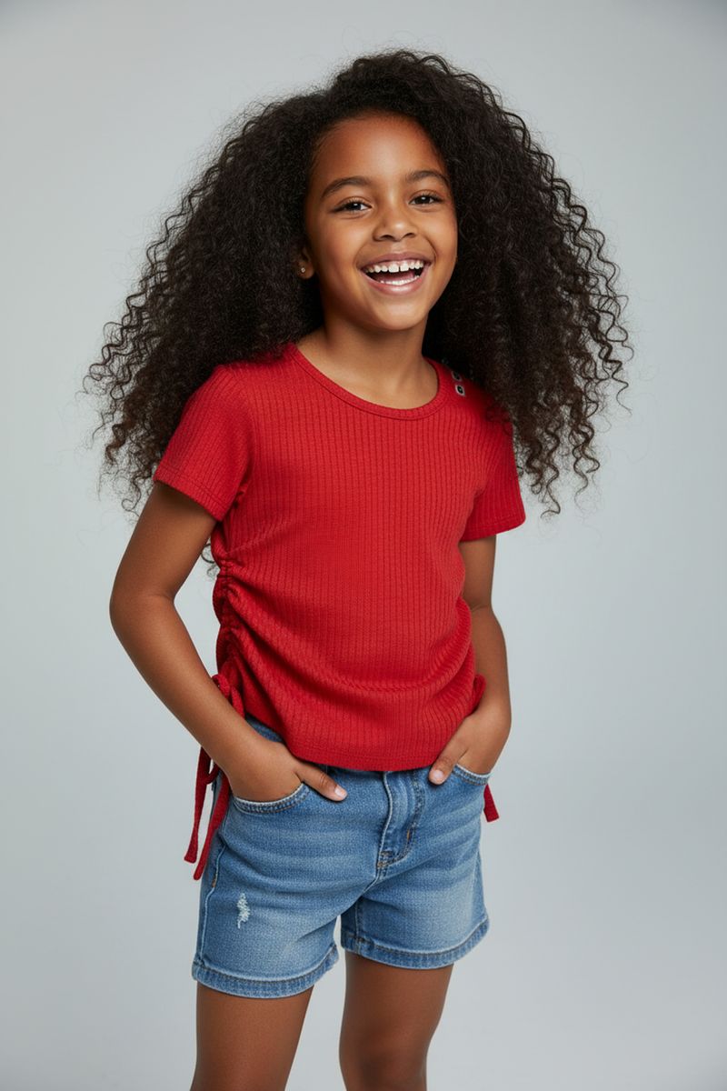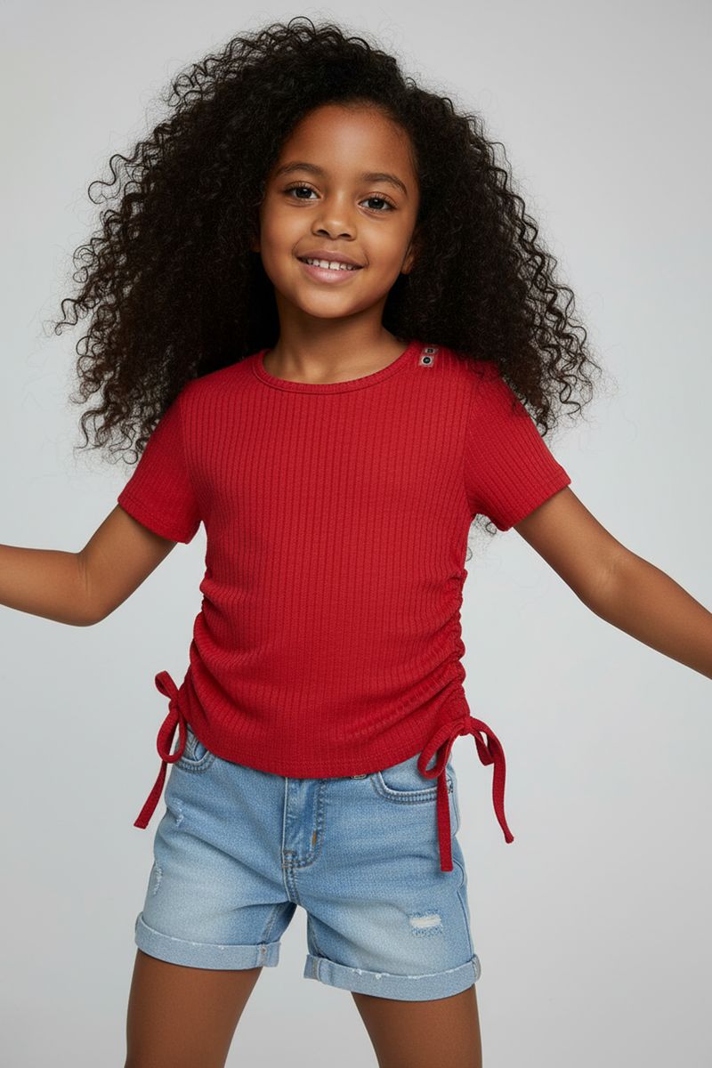 A Blusa Menina Canelada Vermelha com Franzido Caedu oferece estilo e conforto para sua pequena. Com tecido ribana de algodão e poliéster, possui franzido ajustável nas laterais, decote redondo e mangas curtas. Perfeita para um visual moderno e descontraído, esta roupa infantil é ideal para o dia a dia.