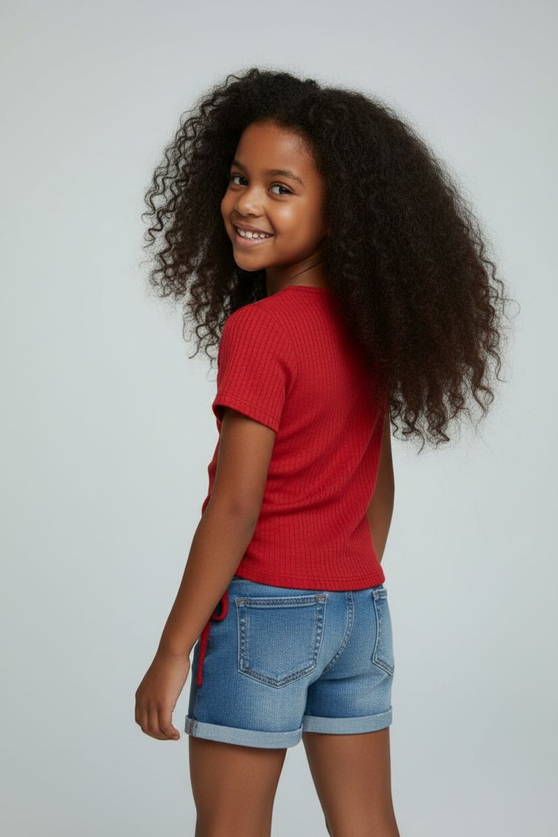 Combine sua Blusa Menina Canelada Vermelha com um estiloso shorts jeans para um look despojado. Para um visual mais arrumado, experimente saias estampadas ou calças leves. Complete com tênis confortáveis ou sandálias delicadas, criando um conjunto versátil para sua menina.