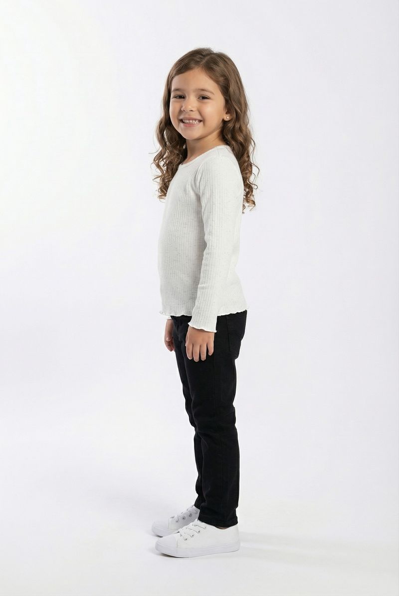 Combine a blusa canelada com uma calça jeans para um look casual, ou uma saia colorida para um visual mais divertido. Nos pés, tênis brancos ou sapatilhas completam o estilo. Para dias mais frescos, adicione uma jaqueta jeans ou um cardigan leve, criando um conjunto versátil e cheio de personalidade para as roupas da sua filha.