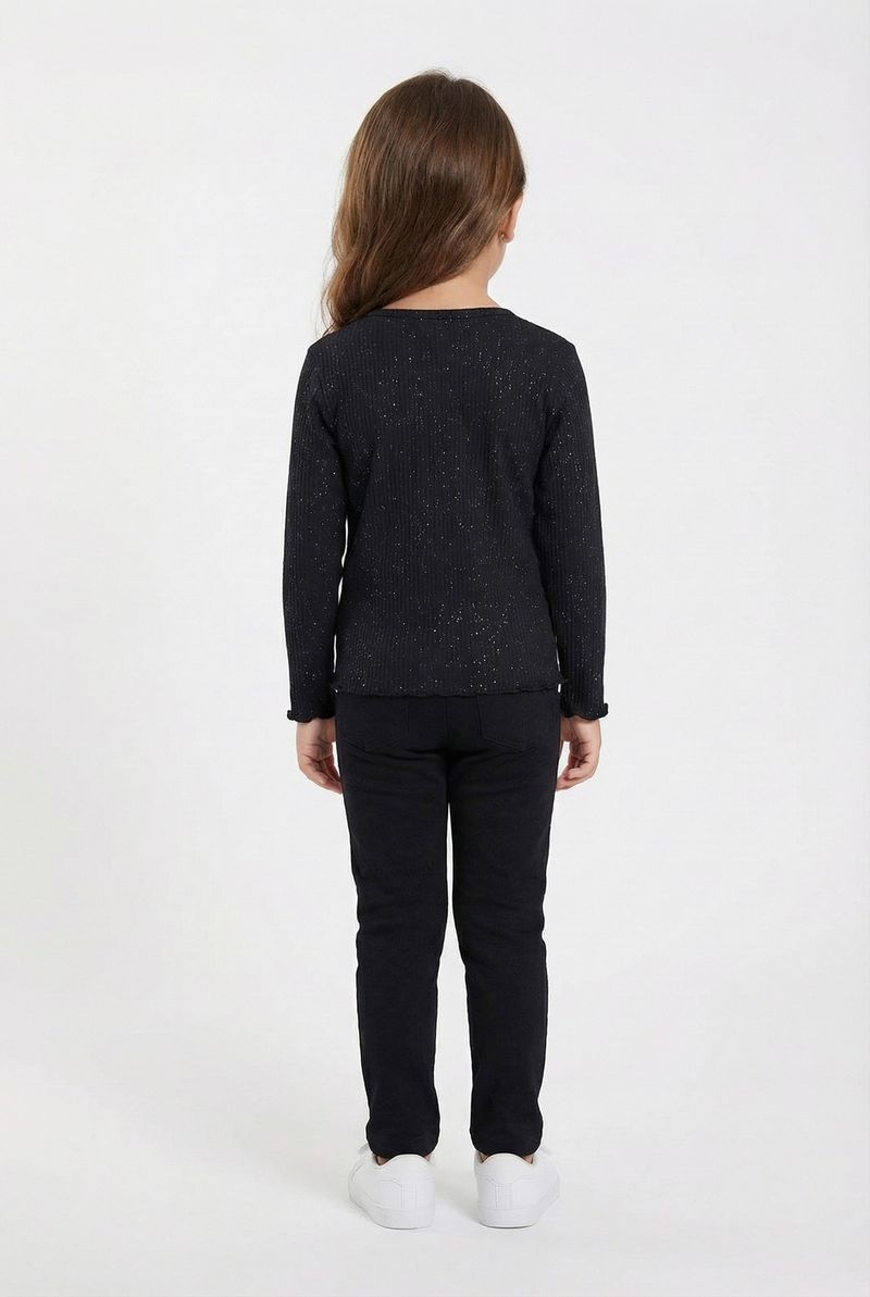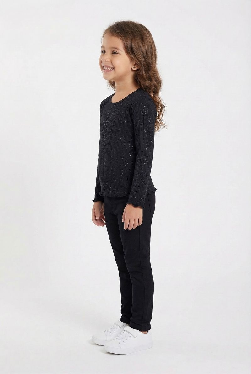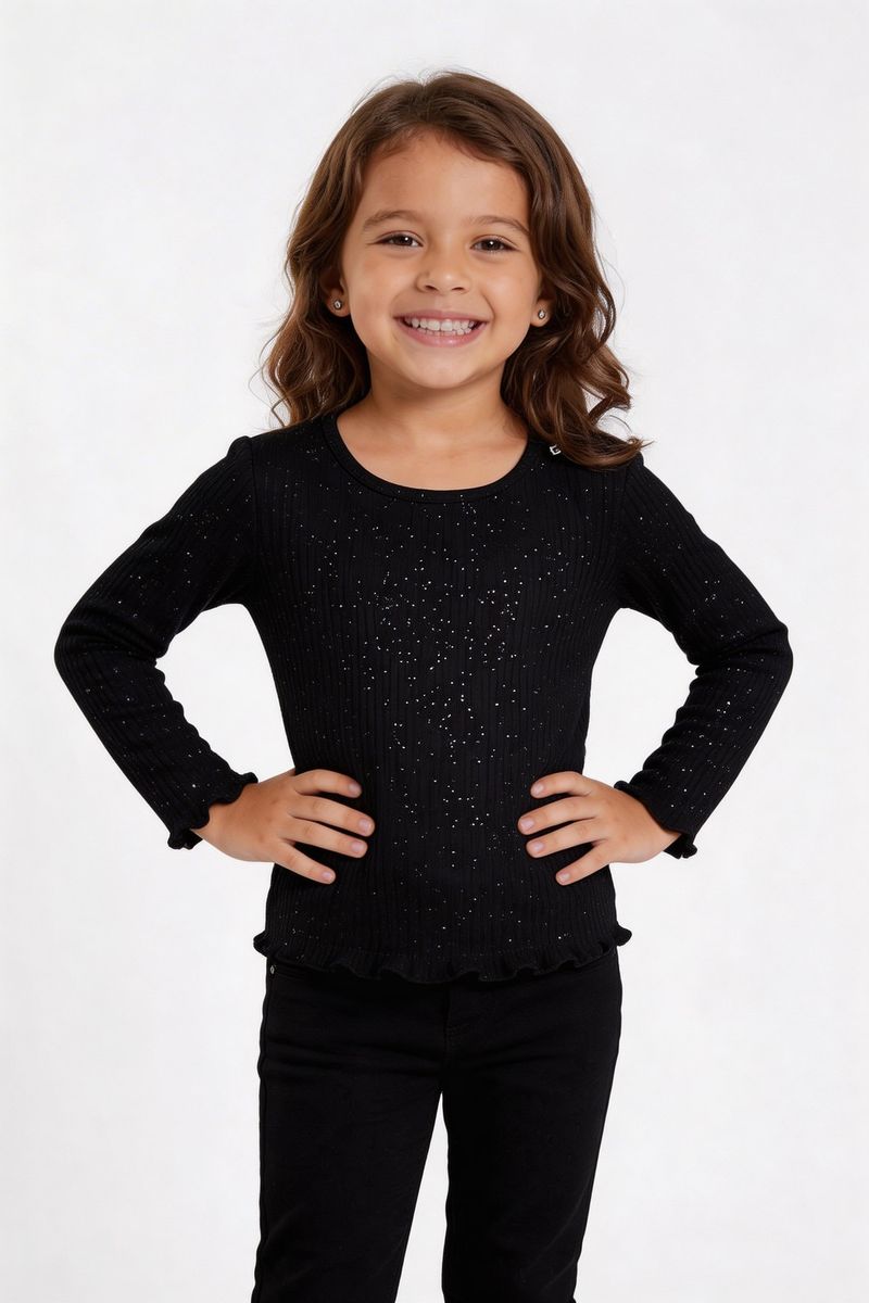 A Blusa Infantil Manga Longa Canelada Glitter Preta Caedu é perfeita para adicionar brilho e estilo ao guarda-roupa da sua pequena. Confeccionada em ribana com textura canelada, oferece conforto e um toque moderno. O glitter prateado espalhado pela superfície e os punhos ondulados garantem um visual encantador e cheio de moda.