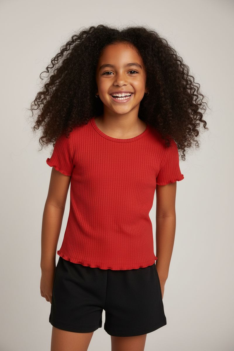 A Blusa Infantil Canelada Vermelha com Detalhe de Babado Caedu é a escolha perfeita para um look charmoso e confortável. Confeccionada em ribana, oferece toque suave e caimento impecável. Seu vibrante tom vermelho e os delicados babados nas mangas e barra adicionam um toque de alegria e estilo único.