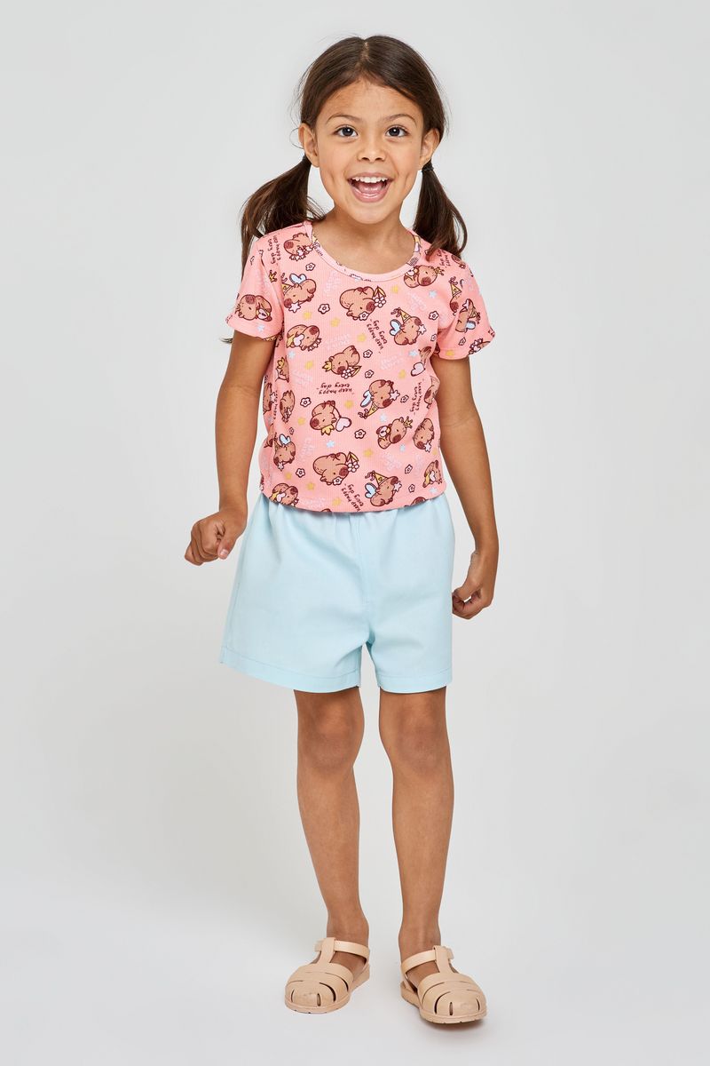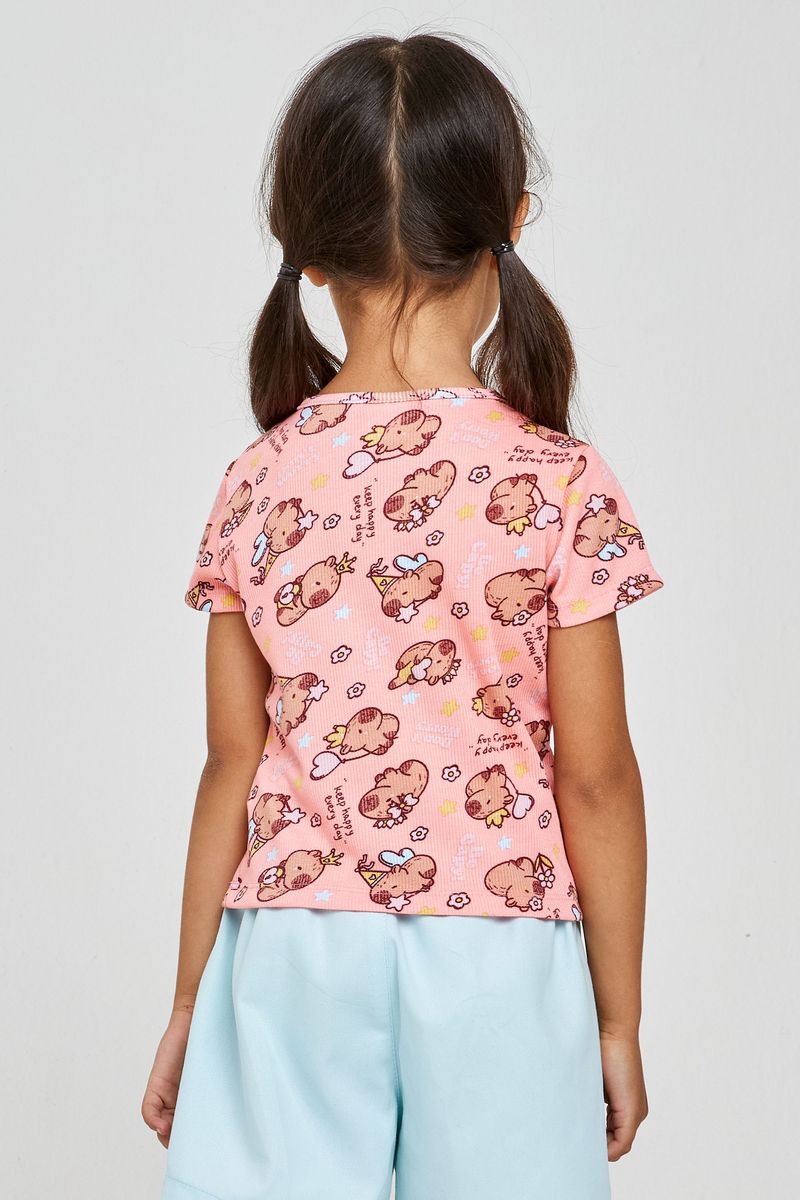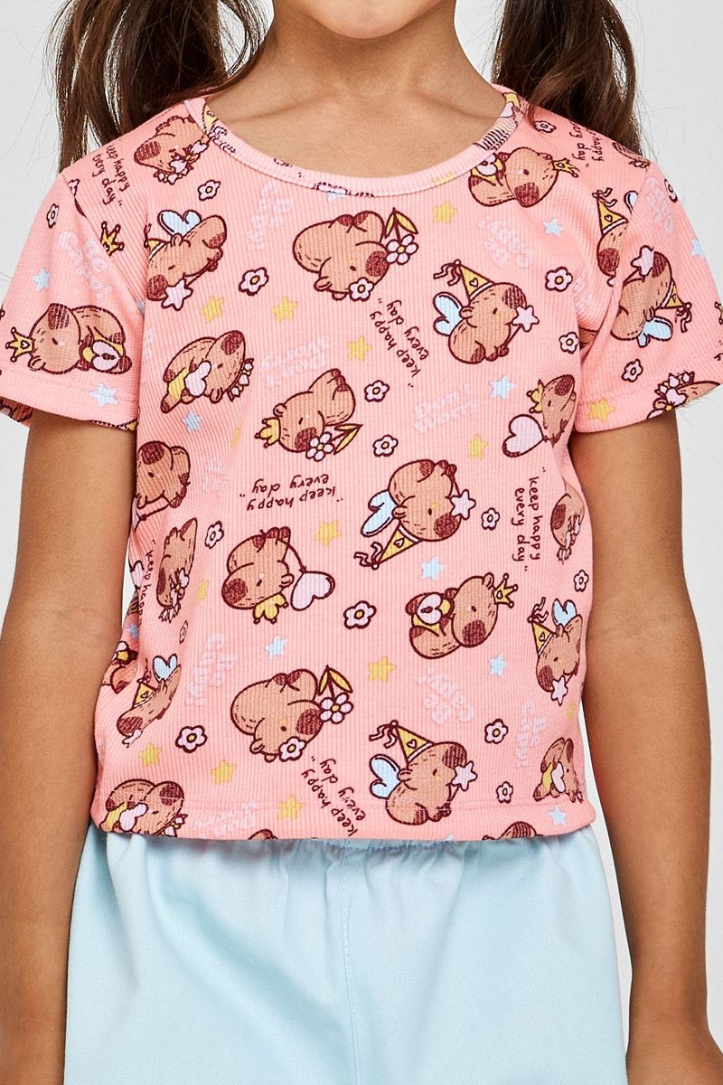 A Blusa Infantil Canelada Caedu em rosa coral é perfeita para manter as pequenas cheias de estilo e alegria. Confeccionada em ribana, oferece conforto e um toque macio. Sua estampa divertida de ursinhos e a frase 'Keep Happy' inspiram momentos felizes, ideal para a moda infantil.