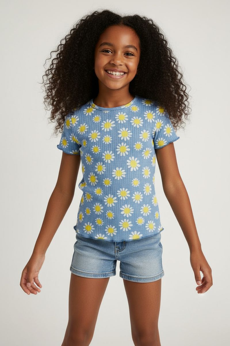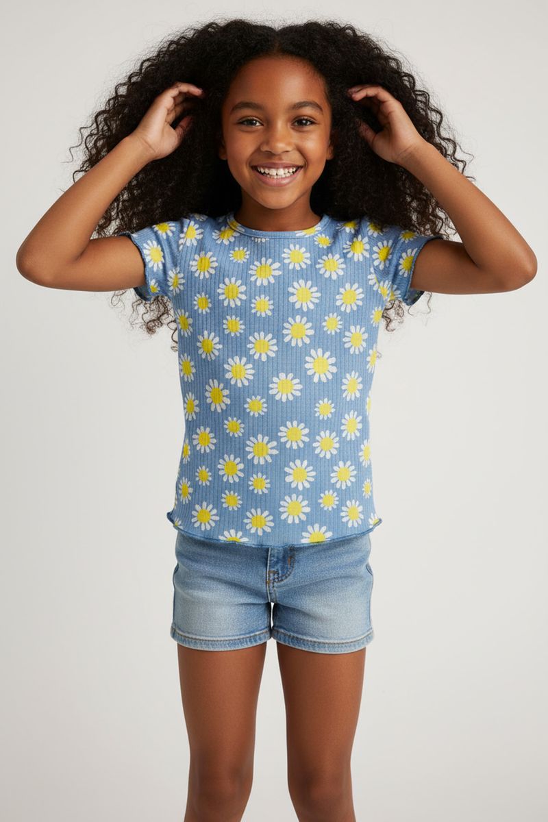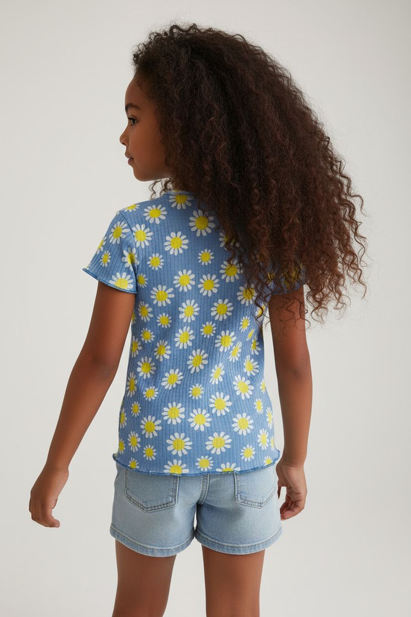 A blusa infantil Caedu canelada azul clara com estampa de margaridas oferece conforto e muito estilo. Feita em ribana, esta roupa infantil de gola redonda é perfeita para adicionar alegria ao guarda-roupa da sua pequena. Uma peça essencial da moda Caedu com preço bom.