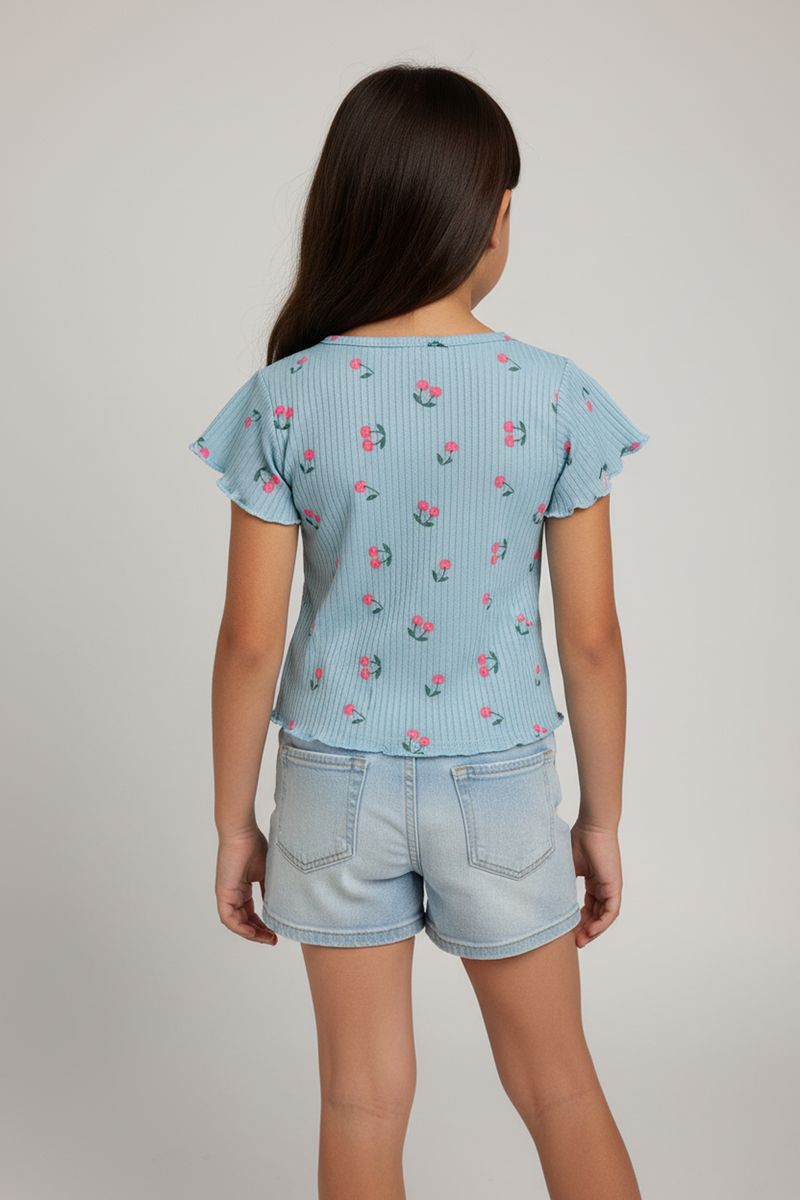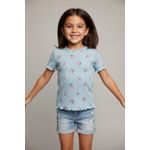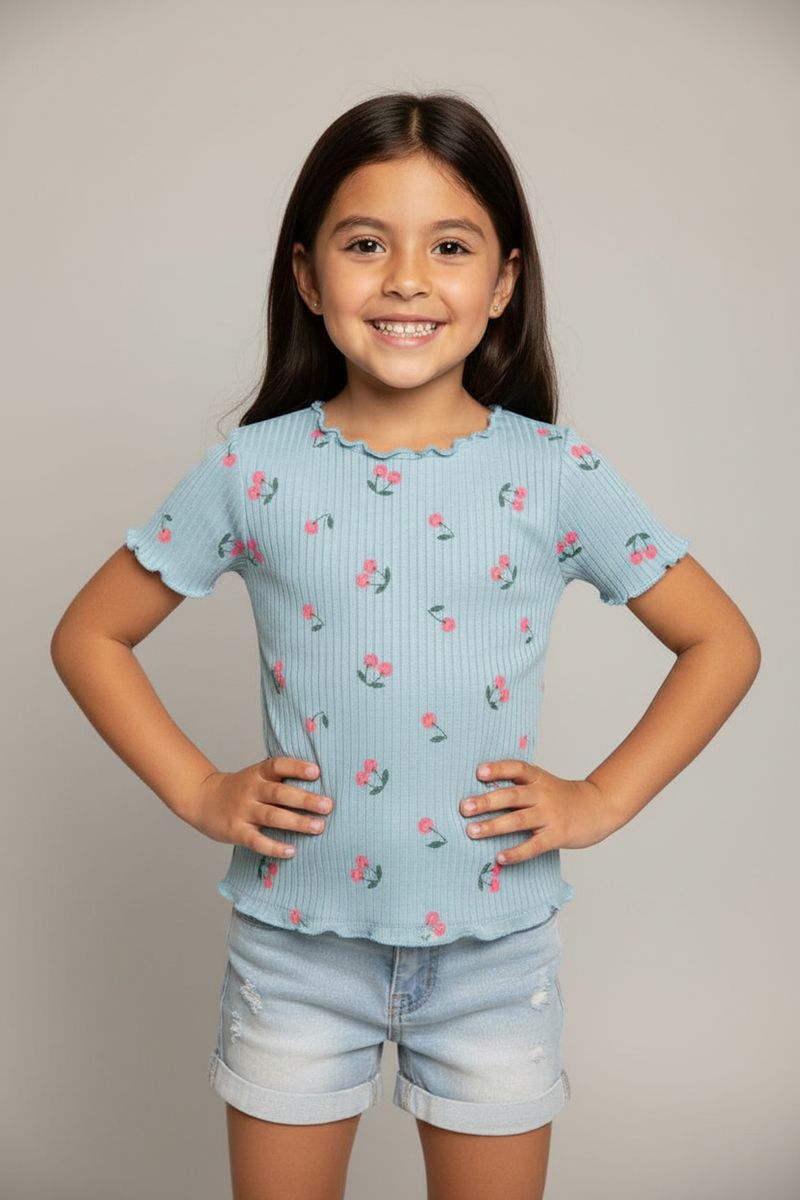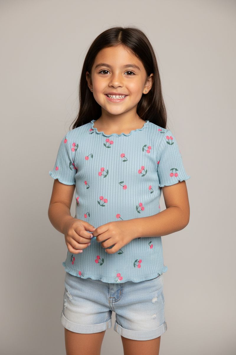 A Blusa Infantil Canelada Azul Claro com Estampa de Cerejas e Babados Caedu oferece conforto e estilo para as pequenas. Feita em ribana, seu design com textura canelada e delicados babados, junto à charmosa estampa de cerejas, garante um visual encantador e moderno para qualquer ocasião.