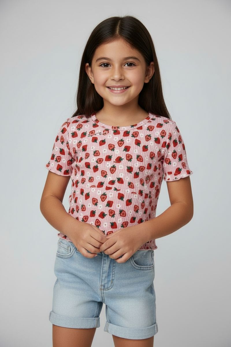 A Blusa Canelada Infantil Menina Rosa Caedu é a escolha perfeita para um visual alegre e confortável. Com estampa vibrante de morangos e flores delicadas, esta roupa infantil em ribana oferece um toque suave e um estilo encantador para as pequenas. Ideal para a moda infantil com preço bom.