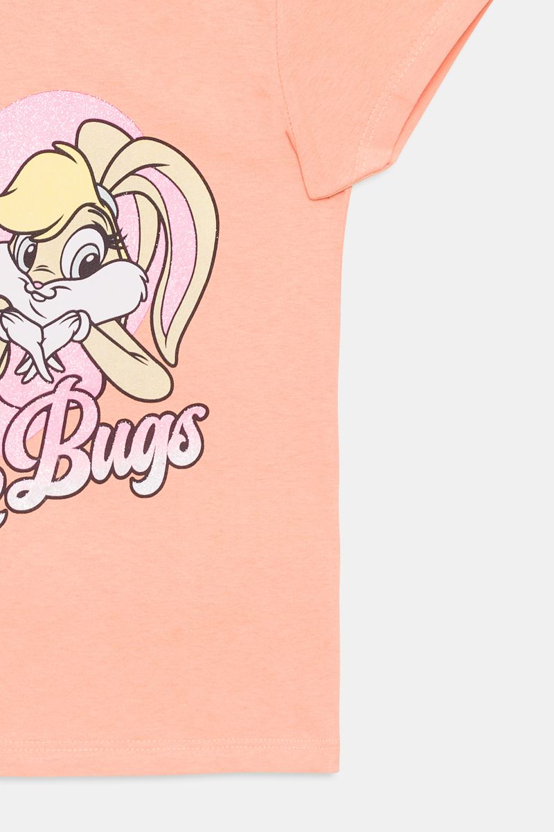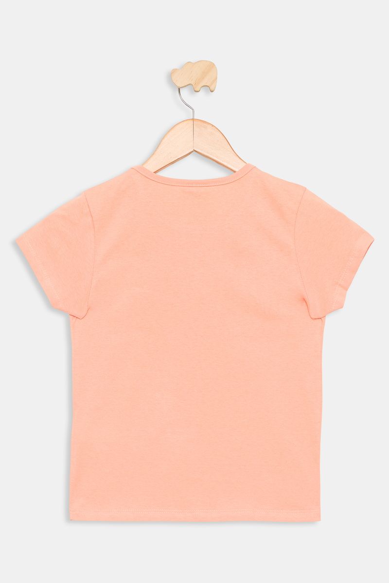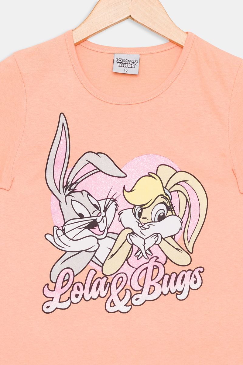 Blusa infantil coral com estampa da Lola, charmosa e cheia de personalidade, para looks modernos e coloridos.