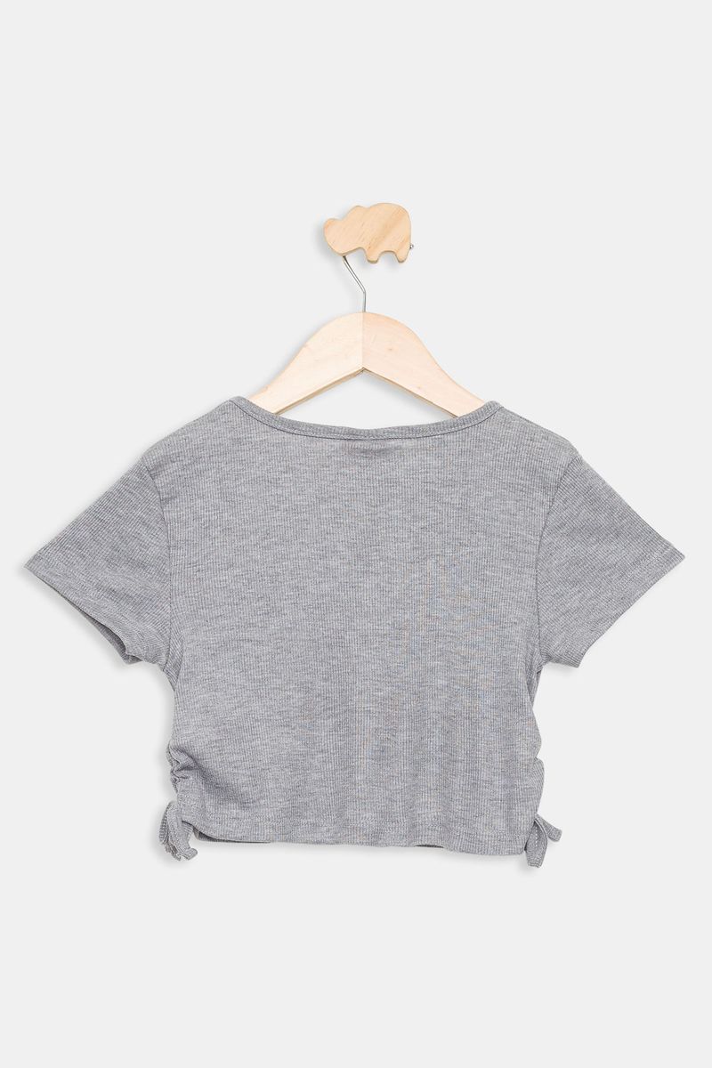 Detalhes: Mangas curtas, decote redondo, textura canelada, franzidos laterais com laços, etiqueta "GIRLS"