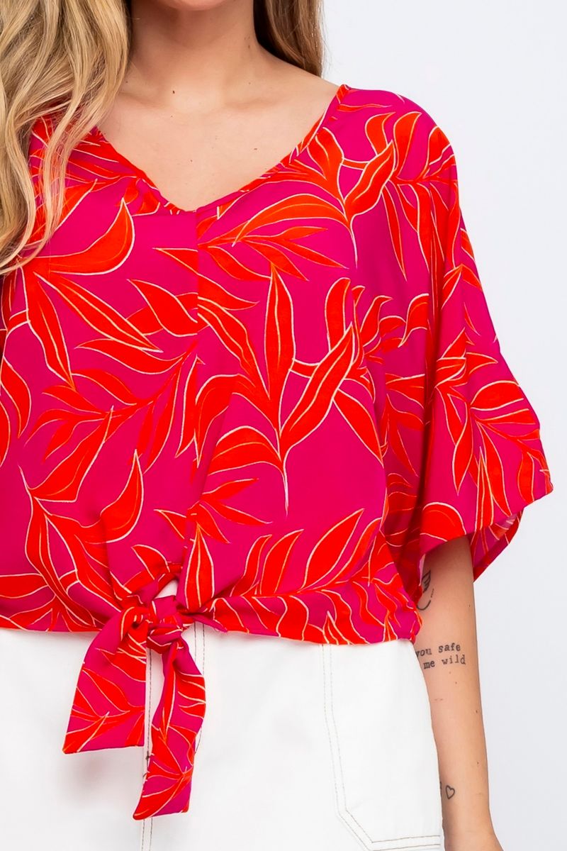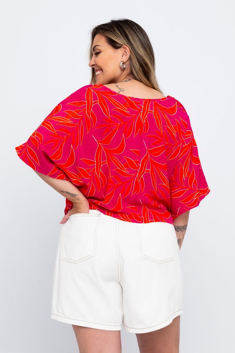 Blusa feminina casual com modelagem solta. A peça possui estampa, decote V, manga 3/4 e barra com nó. Modelo plus size.
