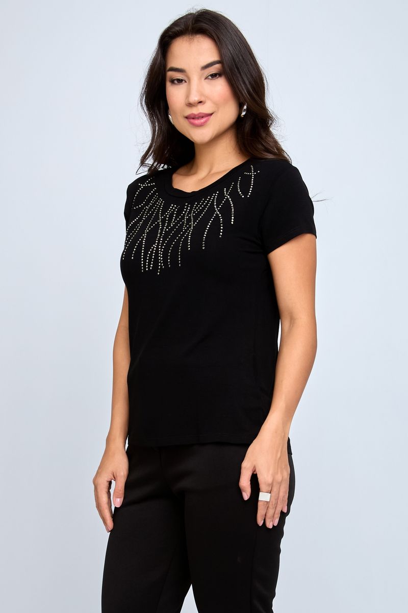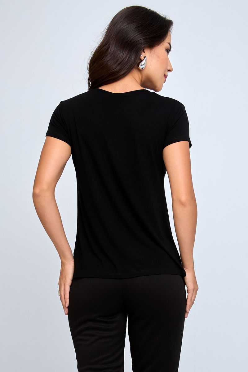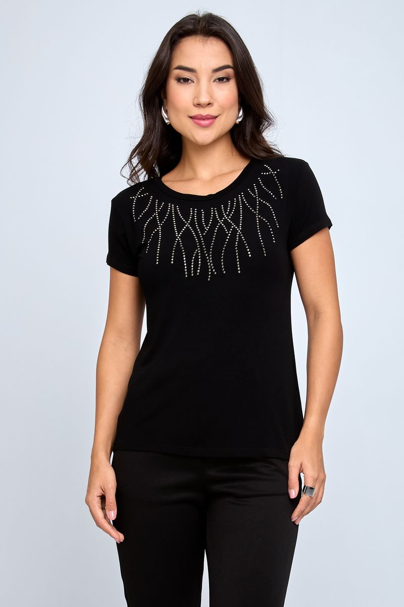 A blusa de manga curta preta é versátil e elegante, uma peça indispensável no guarda-roupa feminino, ideal para diversas ocasiões.