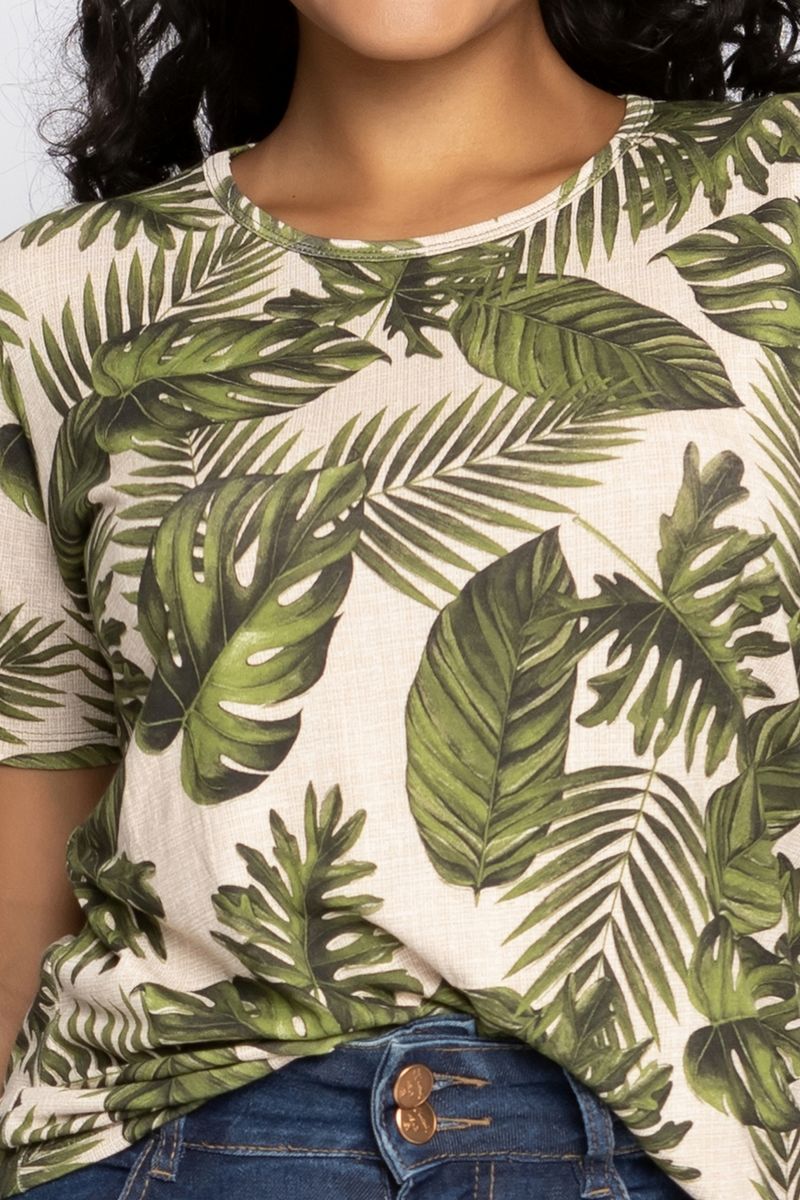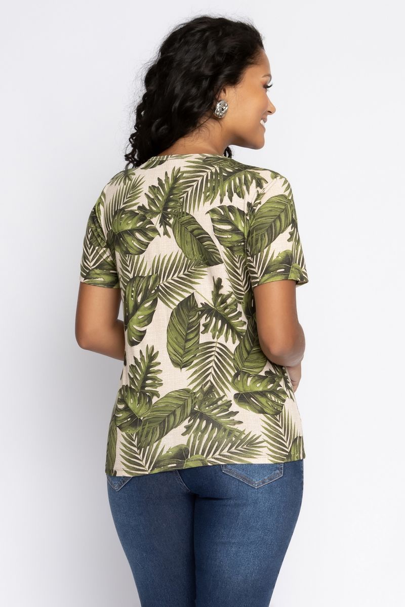 VestuárioFemininoNovidadesFemininoBlusas e CamisetasBlusa Feminina Casual em Viscolycra com Estampa Folhagem Verde