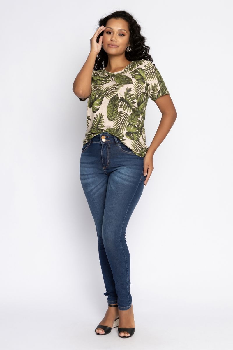 Blusa feminina casual, confeccionada em viscolycra. A peça possui estampa, decote redondo e manga curta.