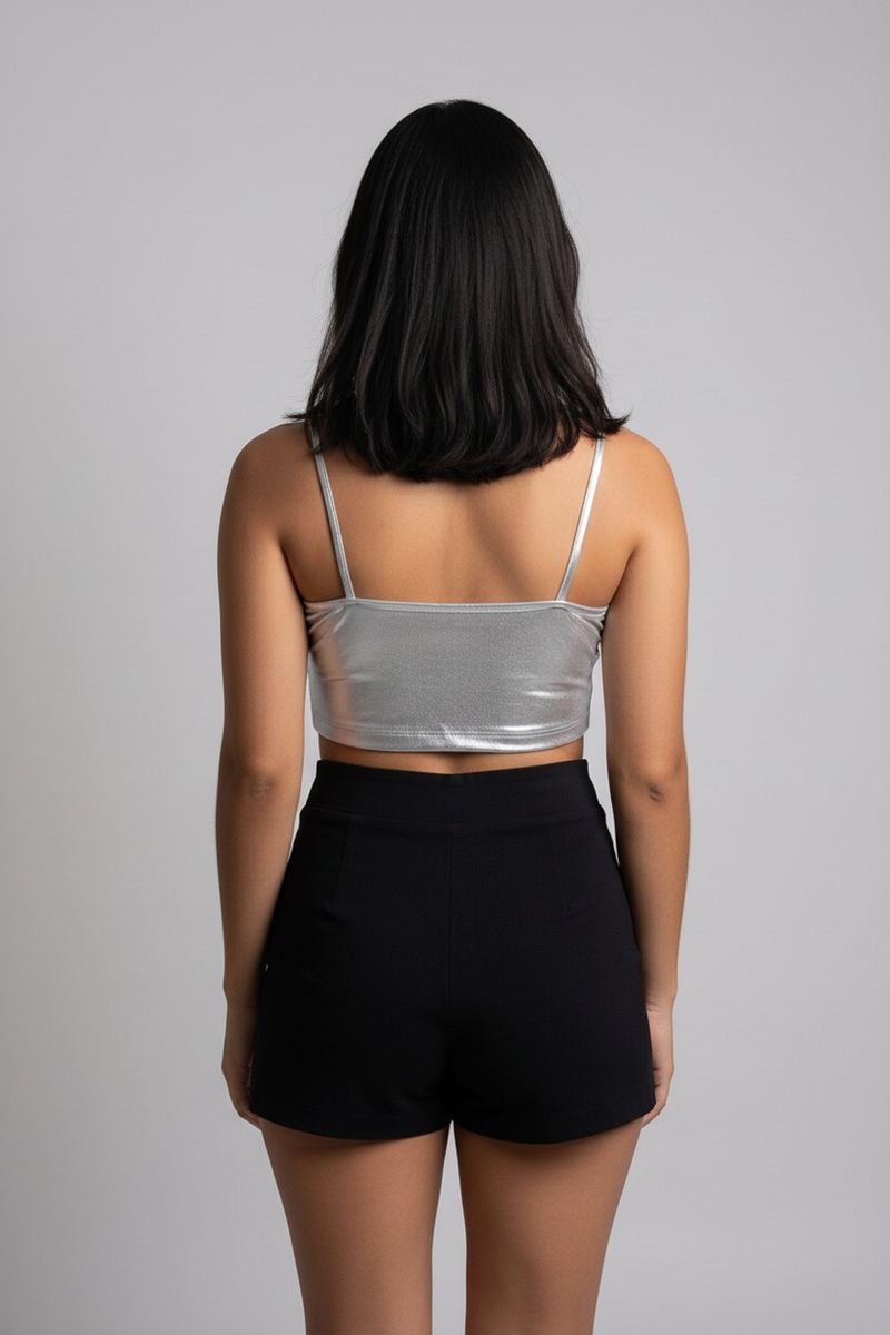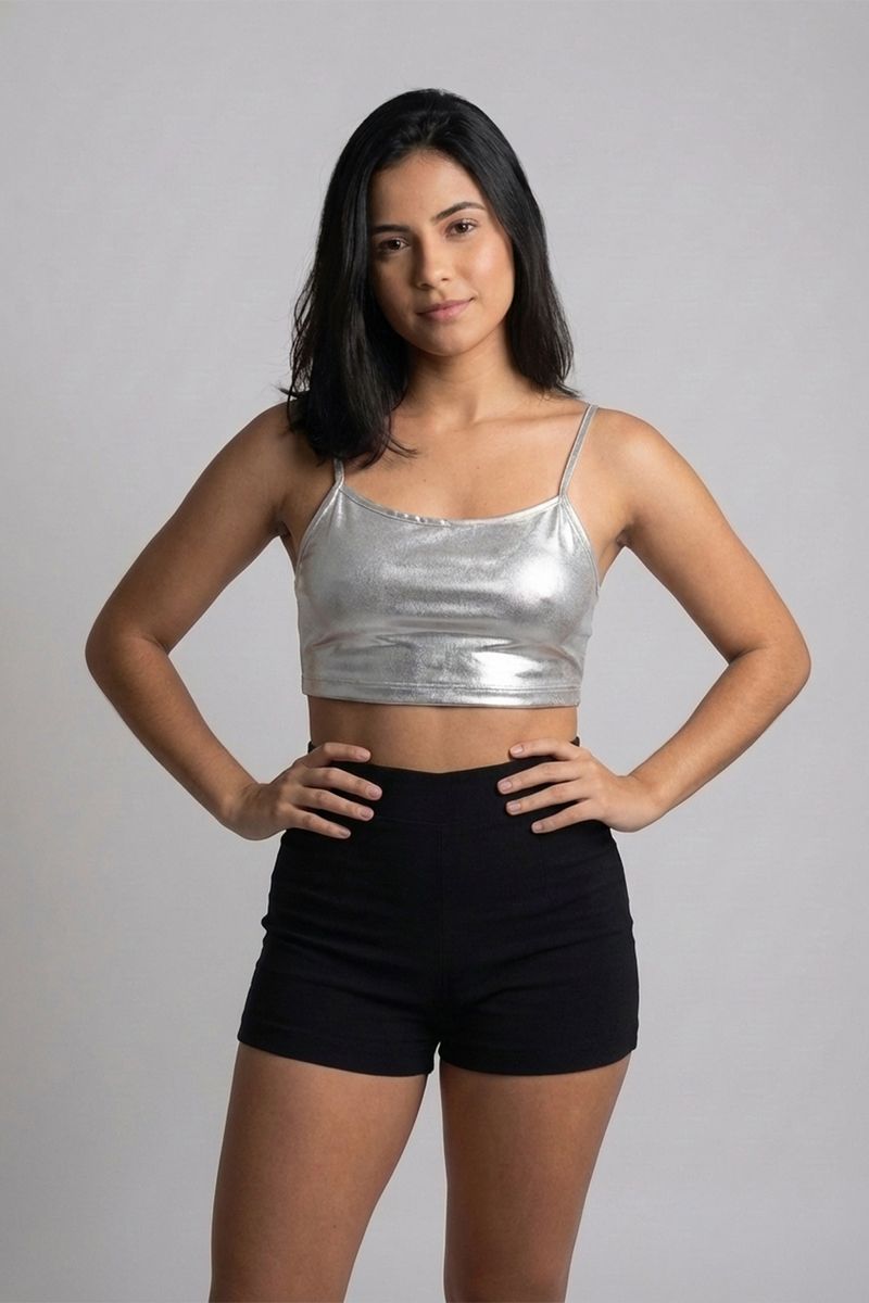 Combine seu Top Cropped Prata Metálico com shorts preto de cintura alta para um visual ousado e moderno, ideal para a noite. Para um estilo sofisticado, aposte em saias midi ou calças de alfaiataria, perfeitas para eventos formais. Complete com sandálias de salto ou tênis brancos para um look casual, e adicione acessórios minimalistas para realçar o brilho. Explore a moda Caedu com jaquetas de couro ou blazers para os dias mais frios.